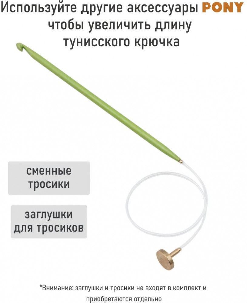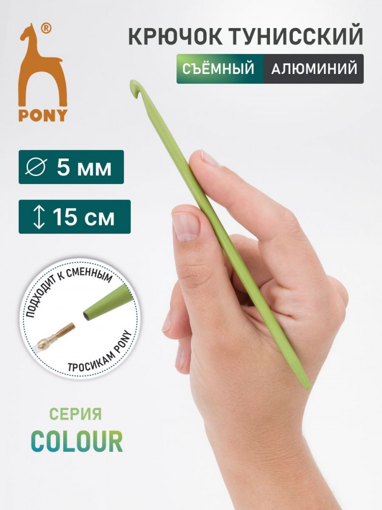 Цветной крючок для вязания Pony Colour со сменной леской порадует рукодельниц своим качеством, оригинальным дизайном и удобством в применении. Крючок ориентирован на удобство при работе в тунисской технике вязания и в других. Сменные лески позволят легко адаптировать инструмент под различные проекты. Система соединения лески обеспечивает невероятно плавное скольжение пряжи по тросику, предотвращая запутывание и облегчая процесс вязания. Вы сможете легко воплотить в жизнь любые творческие задумки: от тончайших кружевных узоров до текстурных мотивов.