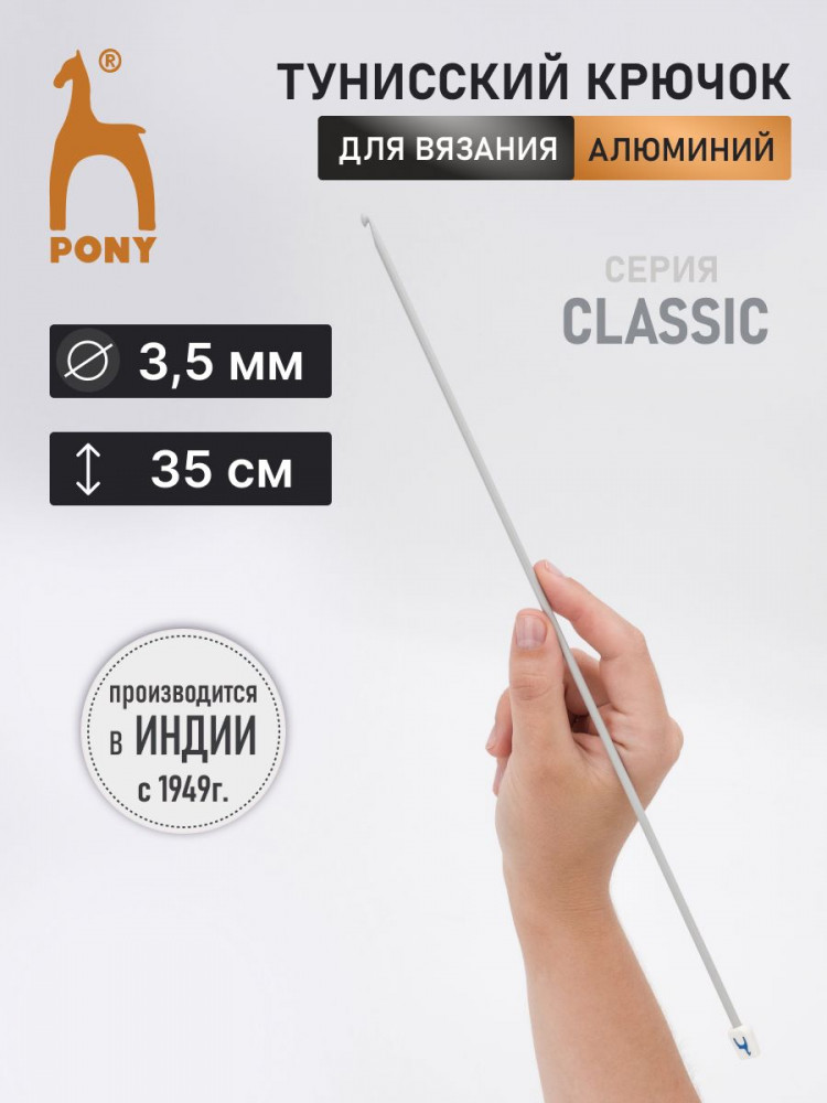 Удлиненный крючок от Pony создан специально для тунисского вязания. Его можно использовать аналогично стандартным крючкам, однако он имеет существенные отличия, приближаясь по функциональности к спицам. Главное отличие- увеличенная длина, необходимая для удержания петель непосредственно на крючке в процессе тунисского вязания. Изготовленный из алюминия, этот крючок отличается повышенной износостойкостью. Благодаря электролитическому оксидированию, поверхность инструмента приобретает идеальную гладкость, что обеспечивает комфортное скольжение нити и облегчает процесс вязания. Кроме того, данная обработка придает крючку дополнительную прочность, гибкость и надежную защиту от коррозии. Удобный пластиковый наконечник препятствует роспуску набранных петель, что позволит вязать с абсолютным комфортом.