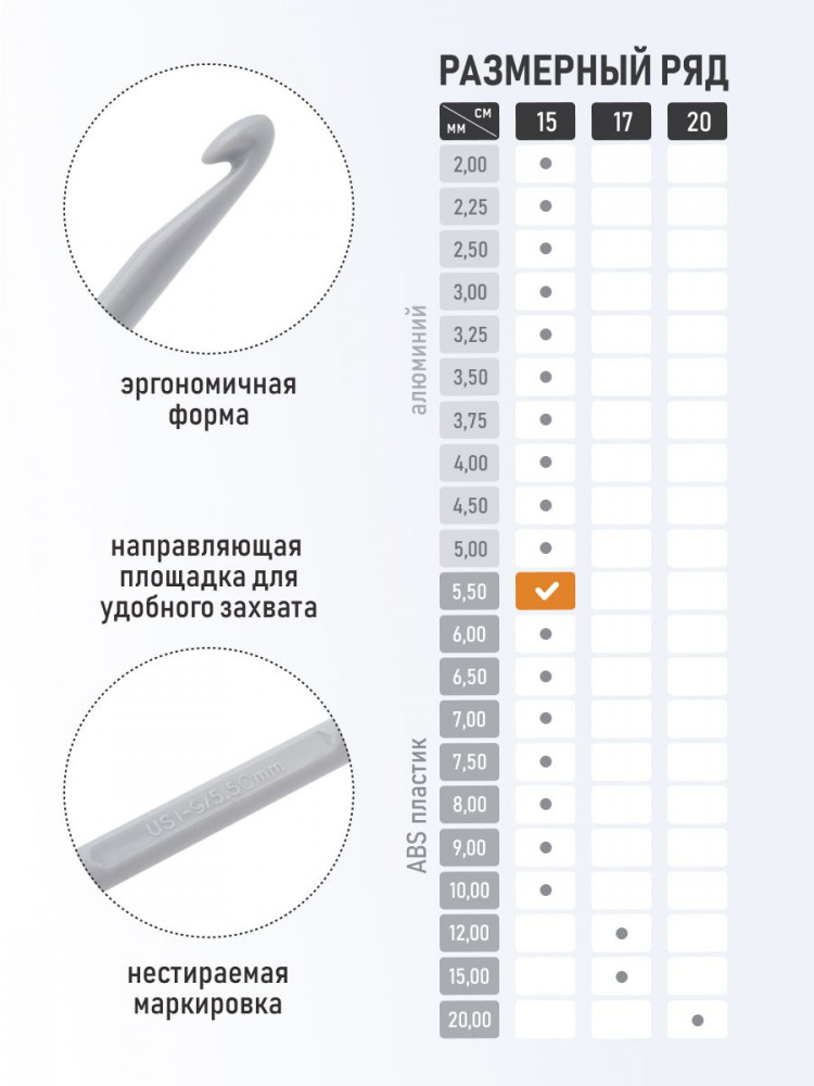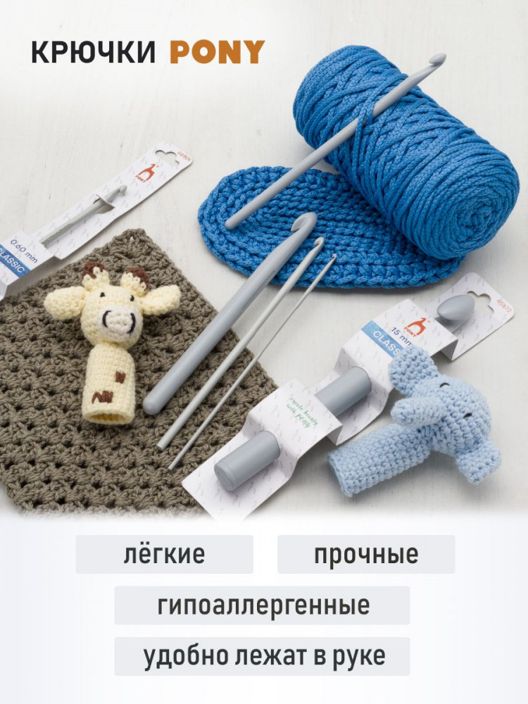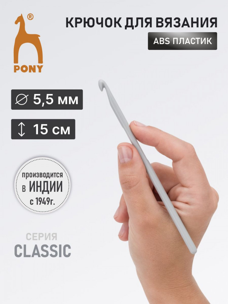 Крючок для вязания от Pony из легкого пластика — прекрасный пример эргономичного и удобного инструмента, идеально подходящего как для опытных мастериц, так и для начинающих вязальщиц. Форма крючка тщательно продумана: направляющая площадка на рукоятке способствует удобному хвату и предотвращает соскальзывание инструмента. Аккуратная классическая форма головки крючка позволяет вывязывать ровные петли для формирования правильного рисунка. Пластик, из которого изготовлен крючок, отличается гладкостью и прочностью. Поверхность крючка идеально ровная и приятная на ощупь. Нитка не цепляется и не рвется, поэтому работа будет доставлять только удовольствие.