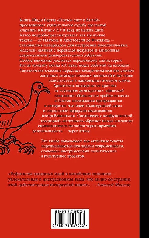 Серия: Слово современной философии Книга Шади Бартш «Платон едет в Китай» прослеживает удивительную судьбу греческой классики в Китае с XVII века до наших дней. Автор подробно рассматривает, как греческие тексты — от Платона и Аристотеля до Фукидида — становились материалом для построения идеологических моделей, начиная с переводов иезуитов и заканчивая современными университетскими дебатами. |