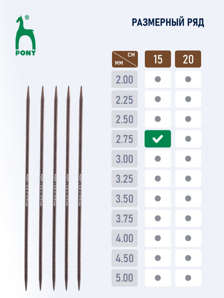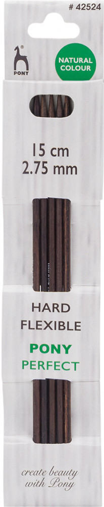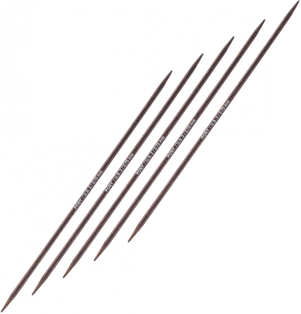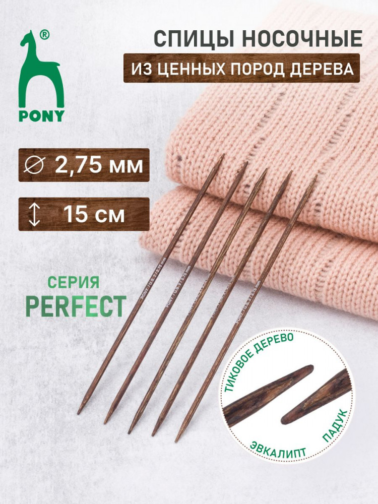 Спицы для вязания носочные Pony Perfect — специализированный инструмент, идеально подходящий для вязания изделий в круговой технике, таких как носки, чулки, гетры, манжеты и горловины свитеров. Для изготовления спиц используется древесина трех редких пород дерева: эвкалипта, падука и тика. Заготовка сырья ведется в лесах, где посадки деревьев возобновляются, позволяя избежать ущерба для природы. Технология производства аналогична той, что применяется при создании бильярдных киев: слои древесины подвергаются прессованию, после чего осуществляется шлифовка и полировка. Тщательно отшлифованные спицы обладают гладкой, шелковистой поверхностью. Они не повреждают структуру нити и приятны на ощупь во время вязания. Каждая пара спиц имеет уникальный древесный рисунок.