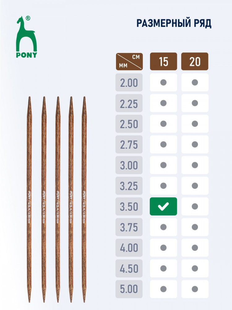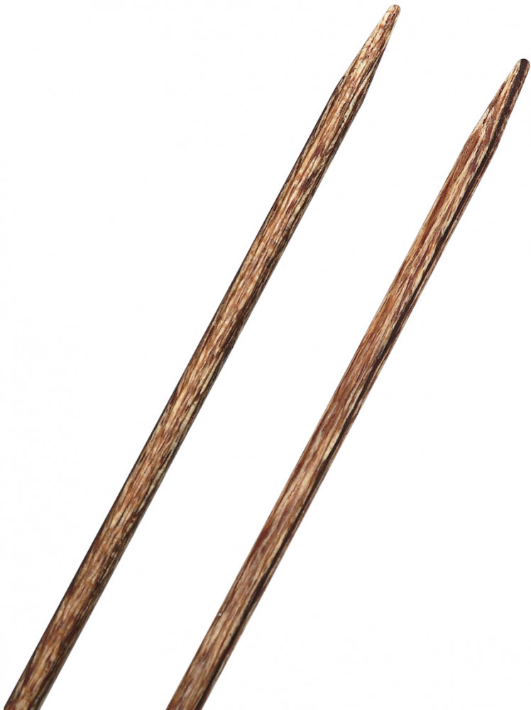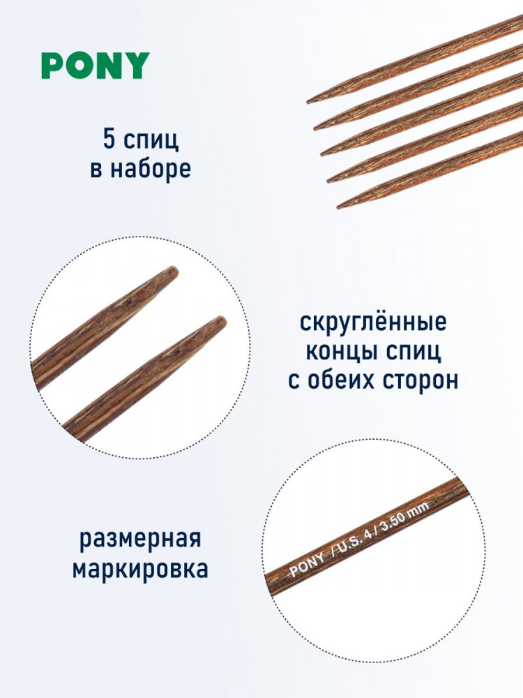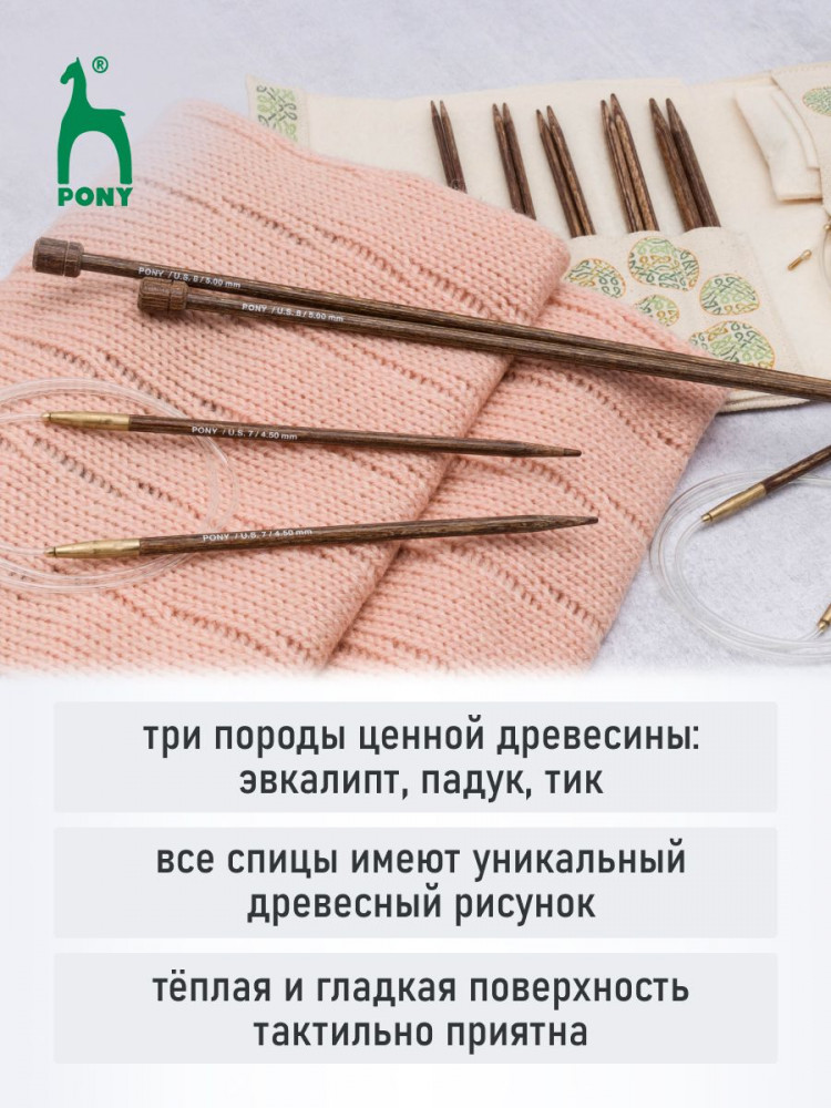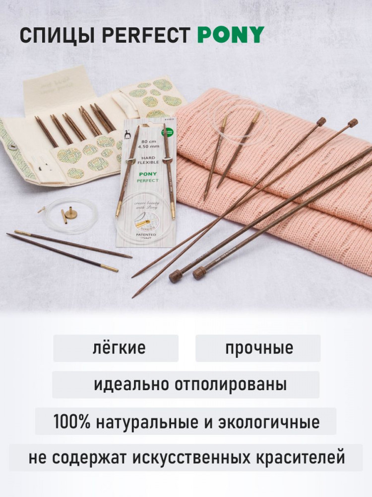 Спицы для вязания носочные Pony Perfect — специализированный инструмент, идеально подходящий для вязания изделий в круговой технике, таких как носки, чулки, гетры, манжеты и горловины свитеров. Для изготовления спиц используется древесина трех редких пород дерева: эвкалипта, падука и тика. Заготовка сырья ведется в лесах, где посадки деревьев возобновляются, позволяя избежать ущерба для природы. Технология производства аналогична той, что применяется при создании бильярдных киев: слои древесины подвергаются прессованию, после чего осуществляется шлифовка и полировка. Тщательно отшлифованные спицы обладают гладкой, шелковистой поверхностью. Они не повреждают структуру нити и приятны на ощупь во время вязания. Каждая пара спиц имеет уникальный древесный рисунок.