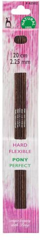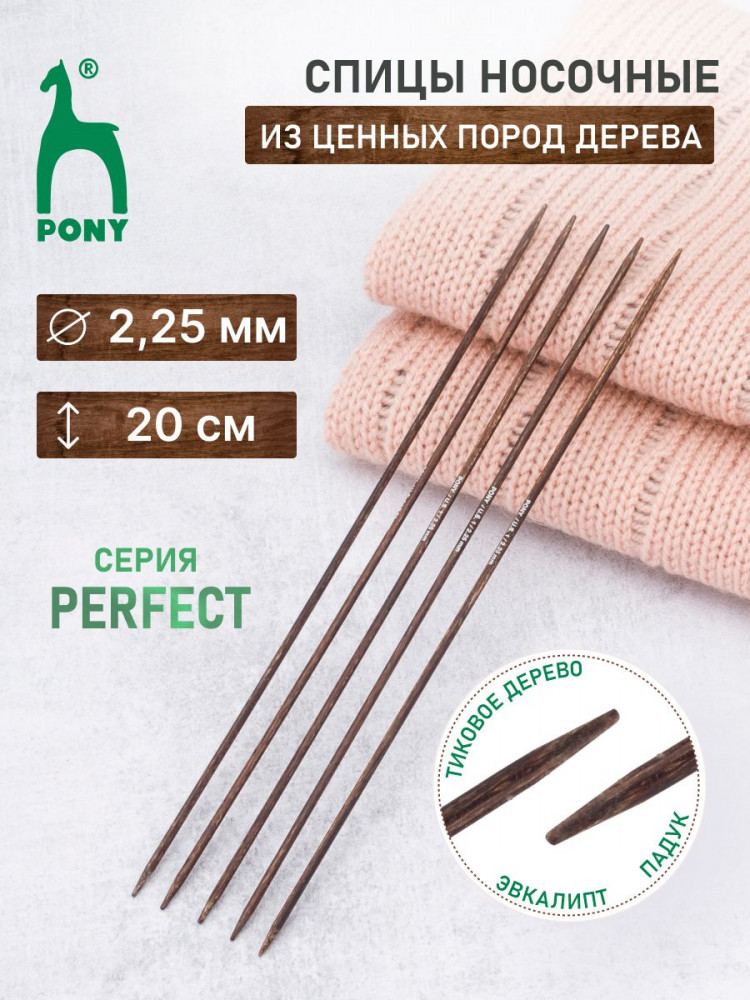 Спицы для вязания носочные Pony Perfect — специализированный инструмент, идеально подходящий для вязания изделий в круговой технике, таких как носки, чулки, гетры, манжеты и горловины свитеров. Для изготовления спиц используется древесина трех редких пород дерева: эвкалипта, падука и тика. Заготовка сырья ведется в лесах, где посадки деревьев возобновляются, позволяя избежать ущерба для природы. Технология производства аналогична той, что применяется при создании бильярдных киев: слои древесины подвергаются прессованию, после чего осуществляется шлифовка и полировка. Тщательно отшлифованные спицы обладают гладкой, шелковистой поверхностью. Они не повреждают структуру нити и приятны на ощупь во время вязания. Каждая пара спиц имеет уникальный древесный рисунок.