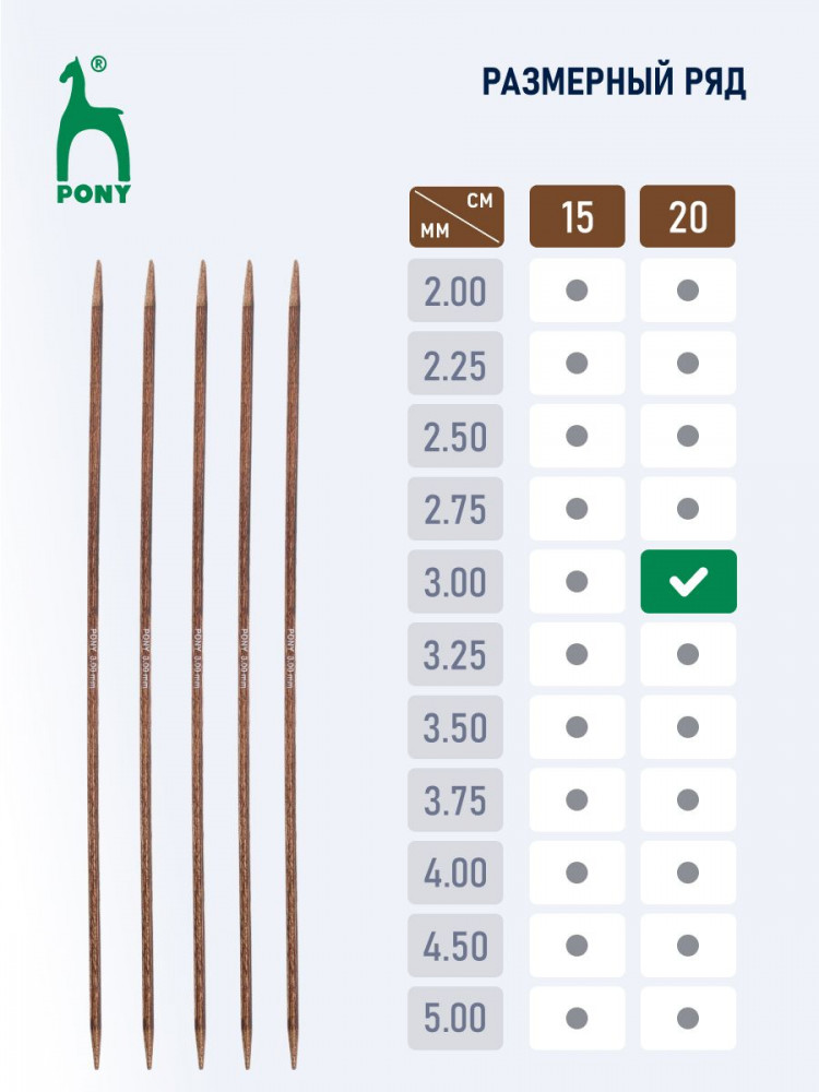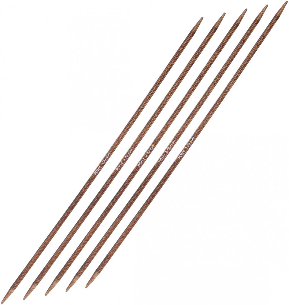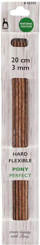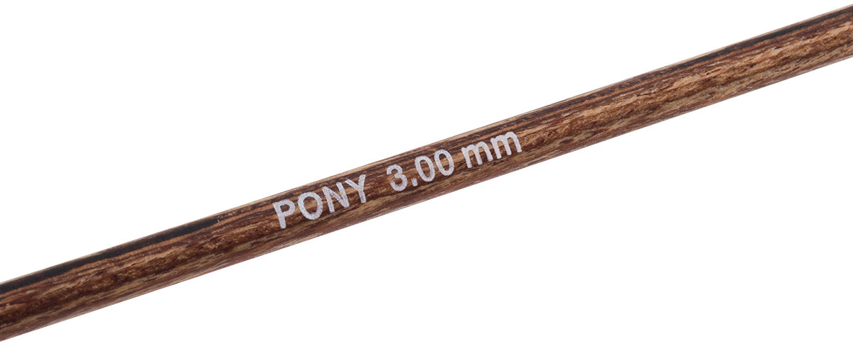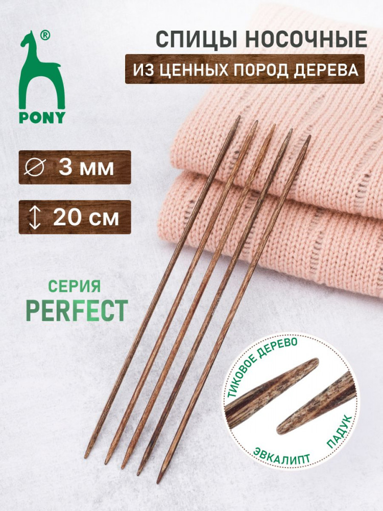 Спицы для вязания носочные Pony Perfect — специализированный инструмент, идеально подходящий для вязания изделий в круговой технике, таких как носки, чулки, гетры, манжеты и горловины свитеров. Для изготовления спиц используется древесина трех редких пород дерева: эвкалипта, падука и тика. Заготовка сырья ведется в лесах, где посадки деревьев возобновляются, позволяя избежать ущерба для природы. Технология производства аналогична той, что применяется при создании бильярдных киев: слои древесины подвергаются прессованию, после чего осуществляется шлифовка и полировка. Тщательно отшлифованные спицы обладают гладкой, шелковистой поверхностью. Они не повреждают структуру нити и приятны на ощупь во время вязания. Каждая пара спиц имеет уникальный древесный рисунок.