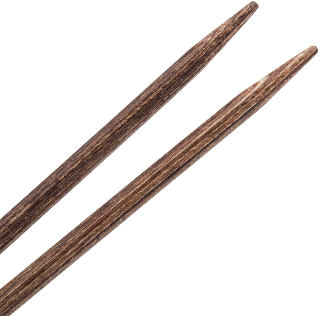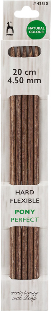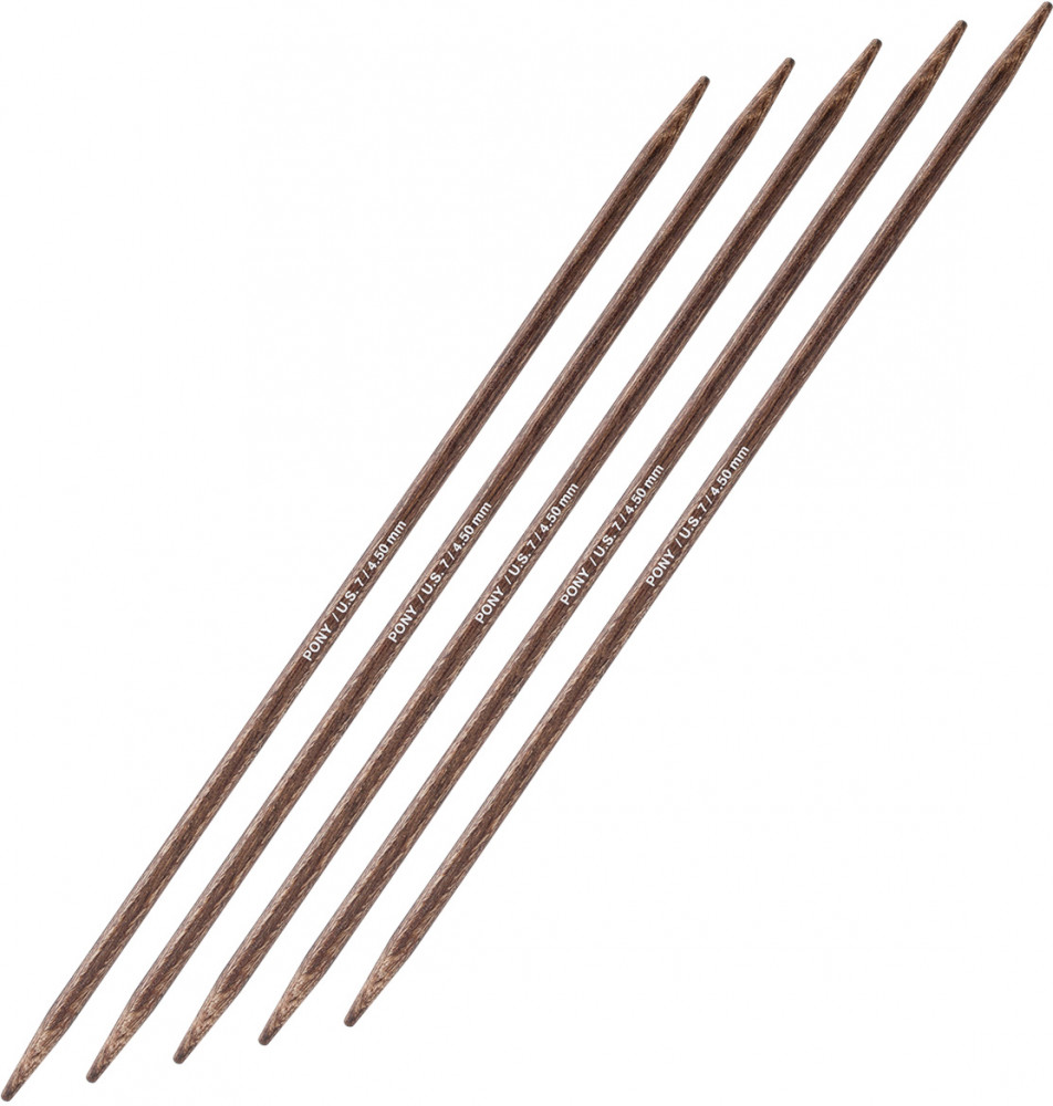 Спицы для вязания носочные Pony Perfect — специализированный инструмент, идеально подходящий для вязания изделий в круговой технике, таких как носки, чулки, гетры, манжеты и горловины свитеров. Для изготовления спиц используется древесина трех редких пород дерева: эвкалипта, падука и тика. Заготовка сырья ведется в лесах, где посадки деревьев возобновляются, позволяя избежать ущерба для природы. Технология производства аналогична той, что применяется при создании бильярдных киев: слои древесины подвергаются прессованию, после чего осуществляется шлифовка и полировка. Тщательно отшлифованные спицы обладают гладкой, шелковистой поверхностью. Они не повреждают структуру нити и приятны на ощупь во время вязания. Каждая пара спиц имеет уникальный древесный рисунок.
