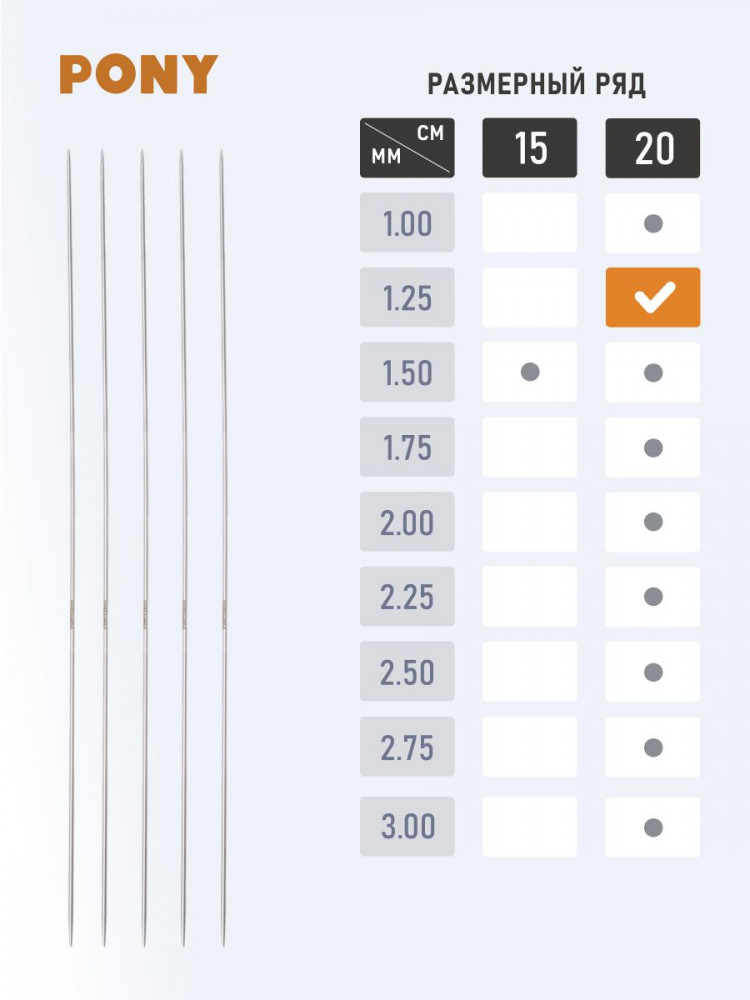 В комплект входят пять спиц одинаковой длины, без ограничителей. Классическая конфигурация- четыре спицы для распределения петель, образующих круговую вязку, и пятая спица, используемая для активного вязания. Важно помнить, что четкое распределение петель по четырем спицам обеспечивает равномерное натяжение и предотвращает искажения готового изделия. Пятая спица, работающая как основной инструмент, позволяет свободно манипулировать петлями и формировать нужный узор. С помощью носочных спиц Pony вы сможете создать уникальные и качественные вязаные изделия, воплощая в жизнь самые смелые идеи. Выбирая носочные спицы для вязания Pony Elan, вы инвестируете в качество и удовольствие от творческого процесса.