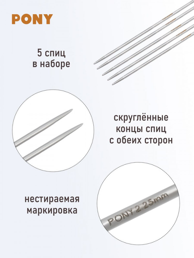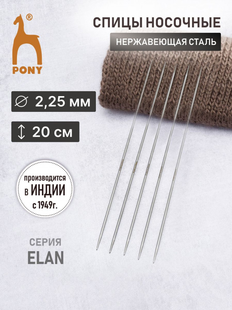 Спицы для вязания носочные Pony Elan — специализированный инструмент, идеально подходящий для вязания изделий в круговой технике, таких как носки, чулки, гетры и манжеты. Спицы изготовлены из стали, практически не гнутся, сохраняя свою форму даже при интенсивном использовании. Безупречно гладкая поверхность спиц предотвращает зацепки и образование узелков. Ваша нить будет двигаться свободно и плавно, создавая ровное полотно. Слегка закругленные концы спиц мягко скользят между петлями, не цепляясь за волокна. Кроме того, закругленные концы не травмируют пальцы.