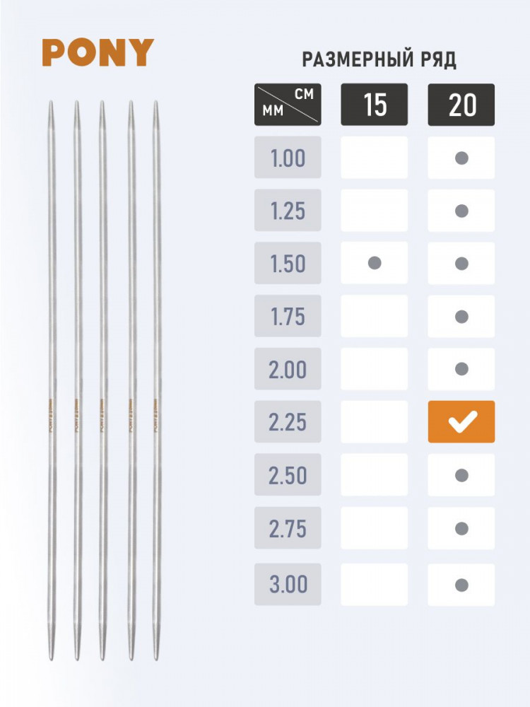 В комплект входят пять спиц одинаковой длины, без ограничителей. Классическая конфигурация- четыре спицы для распределения петель, образующих круговую вязку, и пятая спица, используемая для активного вязания. Важно помнить, что четкое распределение петель по четырем спицам обеспечивает равномерное натяжение и предотвращает искажения готового изделия. Пятая спица, работающая как основной инструмент, позволяет свободно манипулировать петлями и формировать нужный узор. С помощью носочных спиц Pony вы сможете создать уникальные и качественные вязаные изделия, воплощая в жизнь самые смелые идеи. Выбирая носочные спицы для вязания Pony Elan, вы инвестируете в качество и удовольствие от творческого процесса.