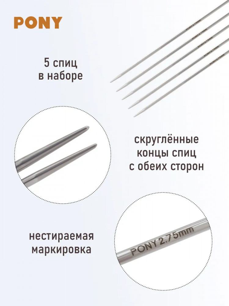 Спицы для вязания носочные Pony Elan — специализированный инструмент, идеально подходящий для вязания изделий в круговой технике, таких как носки, чулки, гетры и манжеты. Спицы изготовлены из стали, практически не гнутся, сохраняя свою форму даже при интенсивном использовании. Безупречно гладкая поверхность спиц предотвращает зацепки и образование узелков. Ваша нить будет двигаться свободно и плавно, создавая ровное полотно. Слегка закругленные концы спиц мягко скользят между петлями, не цепляясь за волокна. Кроме того, закругленные концы не травмируют пальцы.