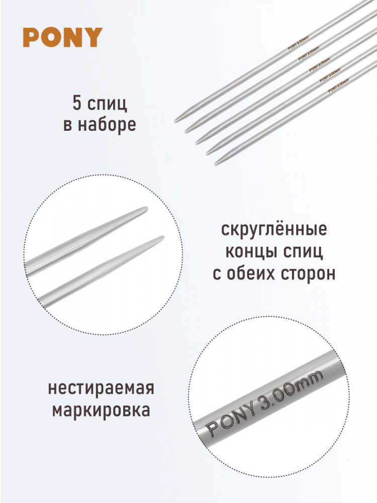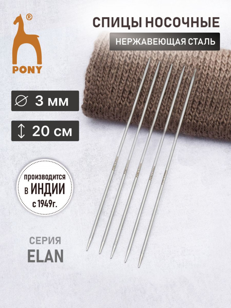 Спицы для вязания носочные Pony Elan — специализированный инструмент, идеально подходящий для вязания изделий в круговой технике, таких как носки, чулки, гетры и манжеты. Спицы изготовлены из стали, практически не гнутся, сохраняя свою форму даже при интенсивном использовании. Безупречно гладкая поверхность спиц предотвращает зацепки и образование узелков. Ваша нить будет двигаться свободно и плавно, создавая ровное полотно. Слегка закругленные концы спиц мягко скользят между петлями, не цепляясь за волокна. Кроме того, закругленные концы не травмируют пальцы.