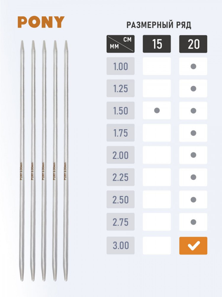 В комплект входят пять спиц одинаковой длины, без ограничителей. Классическая конфигурация- четыре спицы для распределения петель, образующих круговую вязку, и пятая спица, используемая для активного вязания. Важно помнить, что четкое распределение петель по четырем спицам обеспечивает равномерное натяжение и предотвращает искажения готового изделия. Пятая спица, работающая как основной инструмент, позволяет свободно манипулировать петлями и формировать нужный узор. С помощью носочных спиц Pony вы сможете создать уникальные и качественные вязаные изделия, воплощая в жизнь самые смелые идеи. Выбирая носочные спицы для вязания Pony Elan, вы инвестируете в качество и удовольствие от творческого процесса.