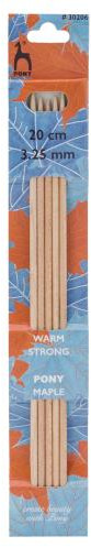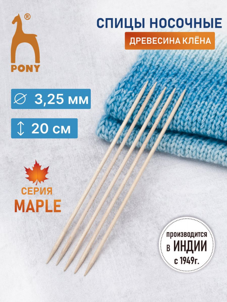 Спицы для вязания носочные Pony Maple — специализированный инструмент, идеально подходящий для вязания изделий в круговой технике, таких как носки, чулки, гетры и манжеты. Сами спицы изготовлены из качественной, плотной и упругой древесины клена. Клен — это прочный и износостойкий материал, который практически не стучит при вязании. Кленовые спицы долговечны, они не скалываются и не ломаются. Тщательно отшлифованные спицы обладают гладкой, шелковистой поверхностью. Кроме того, использование таких спиц помогает защитить пальцы вязальщицы от травмирования. Они не повреждают структуру нити и приятны на ощупь во время вязания.