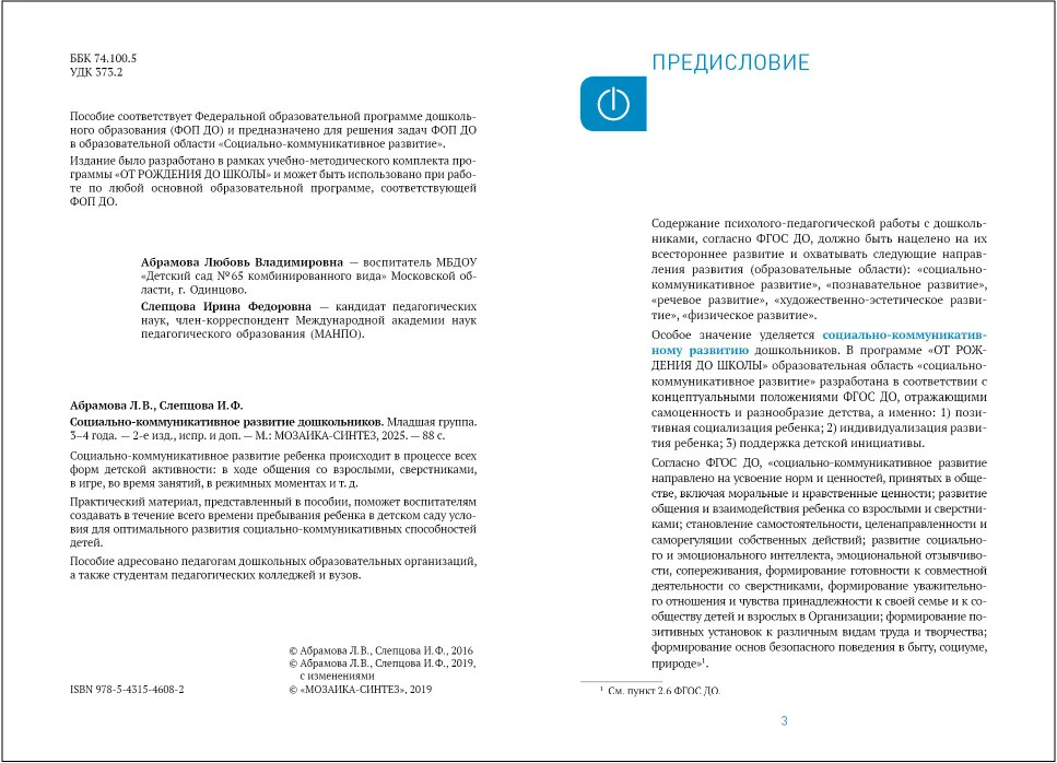 Пособие, изданное в рамках учебно-методического комплекта к программе «От рождения до школы», посвящено социальнокоммуникативному развитию детей 3-4 лет. В нем содержится практический материал, который поможет педагогам организовать совместную деятельность с детьми с учетом концептуальных положений и принципов ФГОС ДО: индивидуализация, социализация, интеграция, вариативность. Методические материалы носят практико-ориентированный характер и могут использоваться в повседневной работе с детьми в детском саду. Пособие адресовано педагогам дошкольных образовательных организаций, а также студентам педагогических колледжей и вузов.