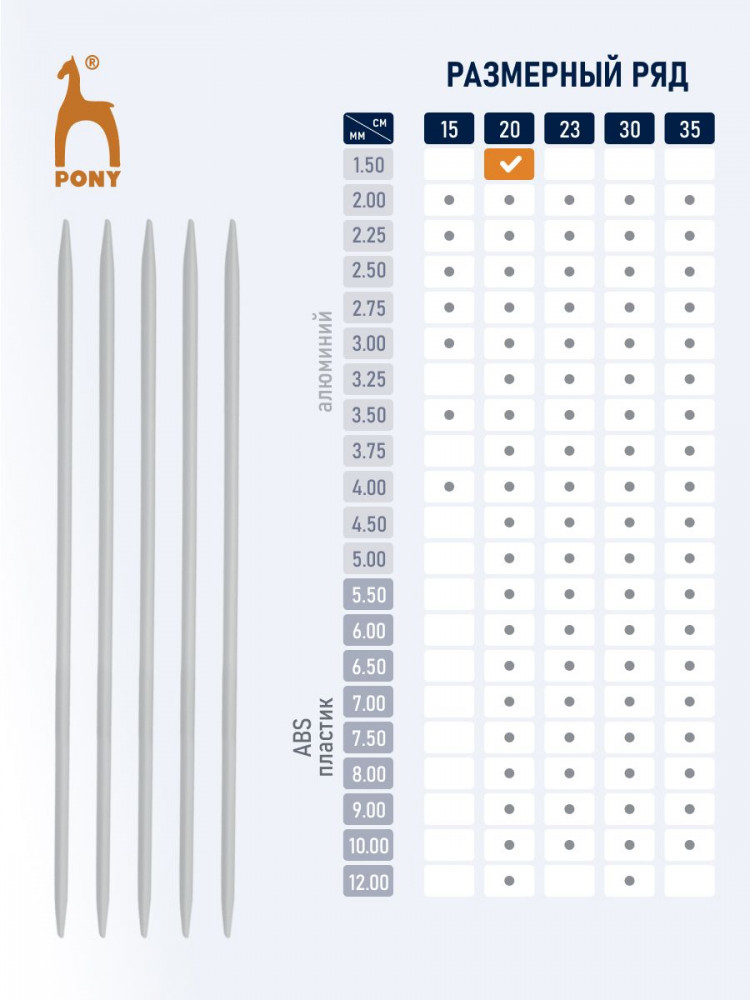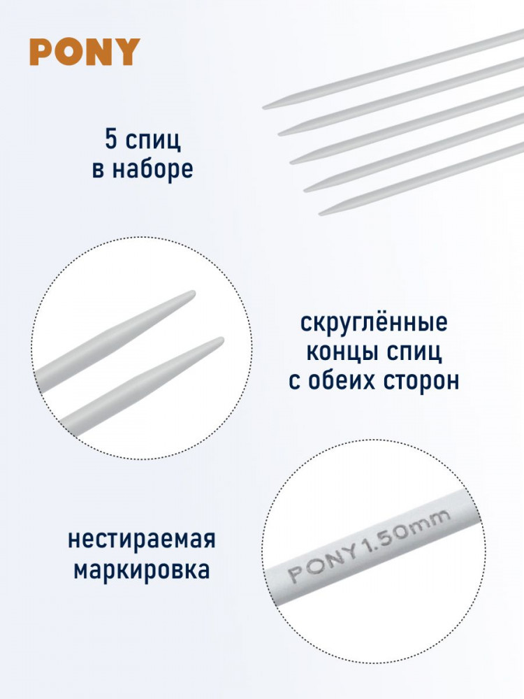 Спицы для вязания носочные Pony — специализированный инструмент, идеально подходящий для вязания изделий в круговой технике, таких как носки, чулки, гетры и горловины свитеров. Спицы для вязания носков изготовлены из качественного алюминия, прошедшего специальную обработку- электролитическое оксидирование. Эта технология придает спицам высокую прочность и устойчивость к деформации, практически исключая их изгиб даже при интенсивном использовании, а также обеспечивает невероятную гладкость поверхности. Благодаря этому пряжа свободно скользит по спицам, не цепляется и не деформируется, а сам процесс вязания становится максимально комфортным. Более того, алюминий обладает замечательной способностью быстро нагреваться от тепла рук. Это особенно приятно в холодное время года, когда теплые спицы значительно повышают комфорт процесса вязания и ускоряют работу.