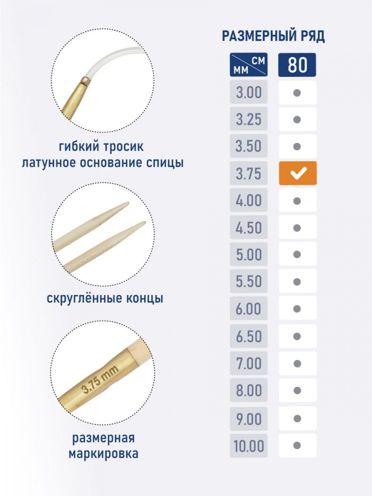 Легкие и прочные круговые спицы изготовленные из древесины клена и объединенные гибким прозрачным тросом, идеально подходят для вязания бесшовных и крупных деталей одежды, таких как ворот или горловина, спинка или передняя часть свитера. Круговые спицы имеют запатентованное соединение с леской — Glydon. Оно обеспечивает плавное скольжение петель при вязании. Гладкая поверхность спиц, соприкасаясь с пряжей, не нарушает структуру нити.
