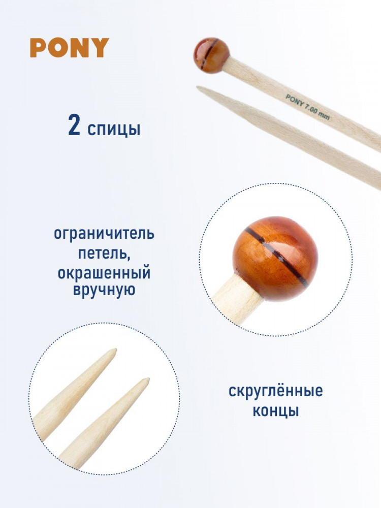 Сами спицы изготовлены из качественной, плотной и упругой древесины клена. Клен — это прочный и износостойкий материал, который практически не стучит при вязании. Кленовые спицы долговечны, они не скалываются и не ломаются. Тщательно отшлифованные спицы обладают гладкой, шелковистой поверхностью. Кроме того, использование таких спиц помогает защитить пальцы вязальщицы от травмирования. Они не повреждают структуру нити и приятны на ощупь во время вязания. Ограничители для спиц надежно удерживают петли, а также служат украшением благодаря покрытию природным красителем. Для тех, кто любит путешествовать, спицы Pony Maple станут отличным спутником: многие авиаперевозчики позволяют провозить деревянные спицы вместе с ручной кладью в пассажирском салоне. Вы всегда сможете иметь под рукой любимые инструменты для вязания, где бы вы ни находились. Спицы для вязания прямые Pony Maple станут незаменимым инструментом для любой мастерицы, которая ценит красоту и качество в каждой детали.
