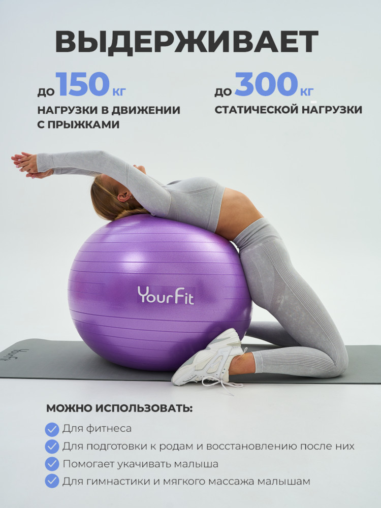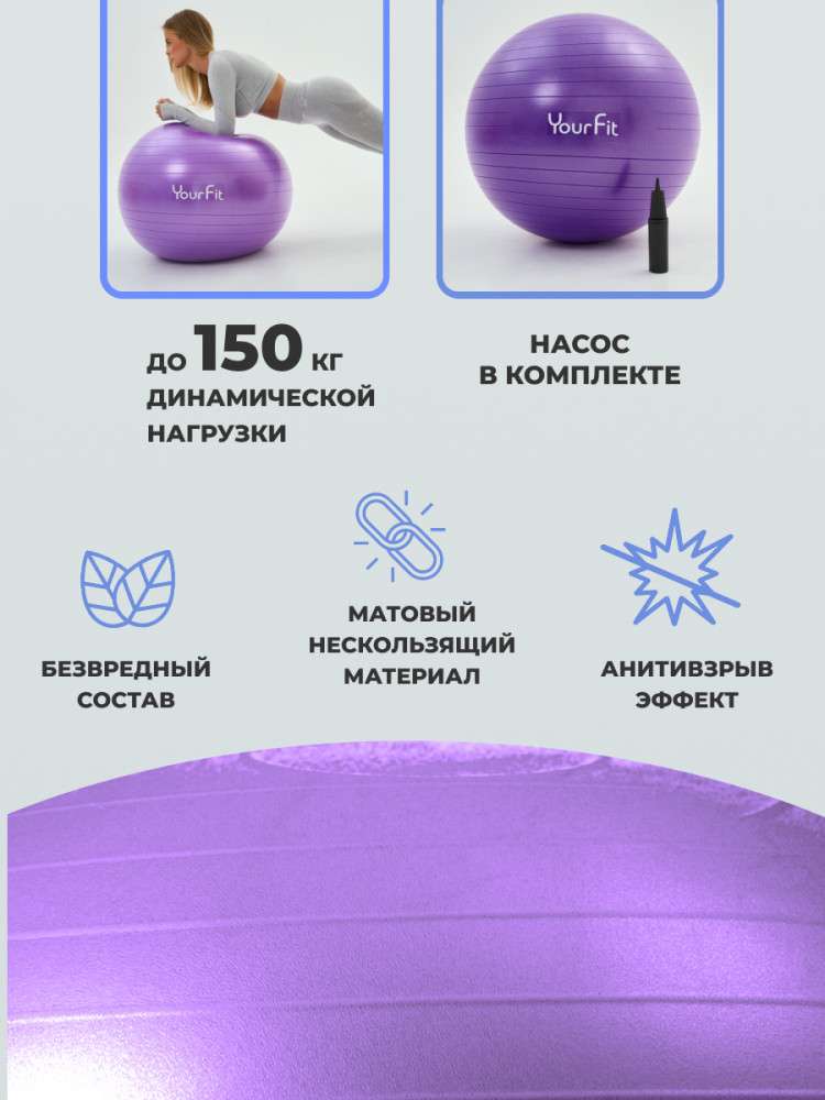 Фитбол — универсальный гимнастический мяч-тренажер для дома и зала. Он помогает улучшить баланс, укрепить мышечный корпус и спину, разтренировать суставы и улучшить осанку. Упругий мяч поддерживает тело в физиологическом положении, уменьшая нагрузку на поясницу. Благодаря компактности и легкости его удобно брать на тренировку или использовать вместо стула для профилактики усталости. Этот большой мяч для йоги и фитнеса подходит новичкам и опытным пользователям.