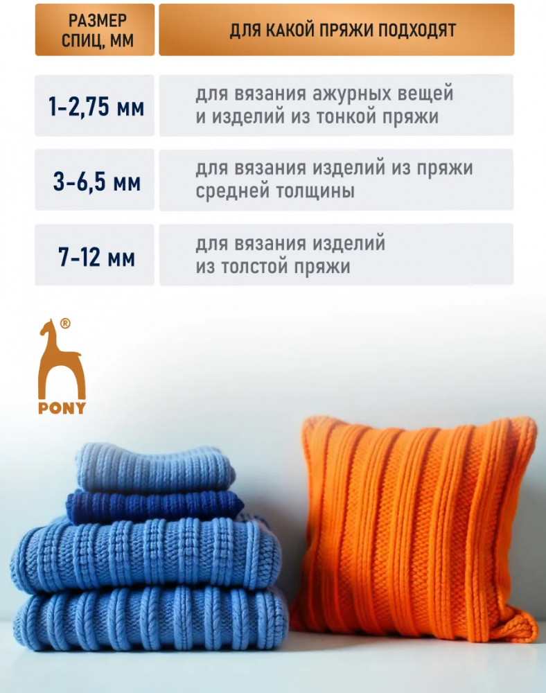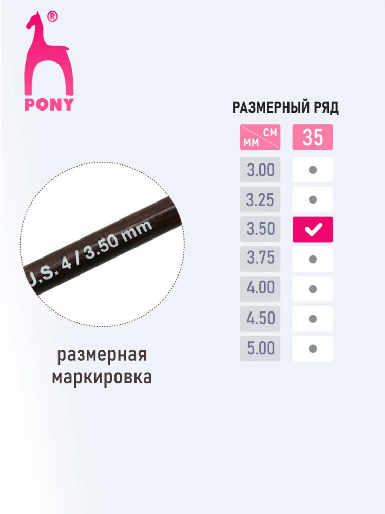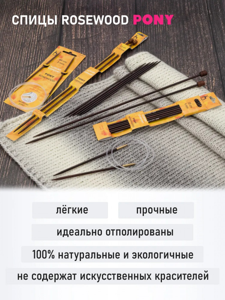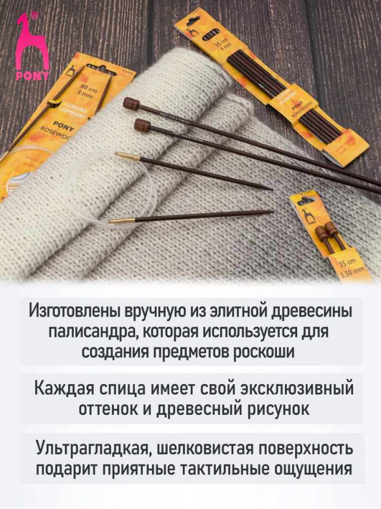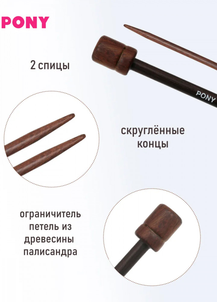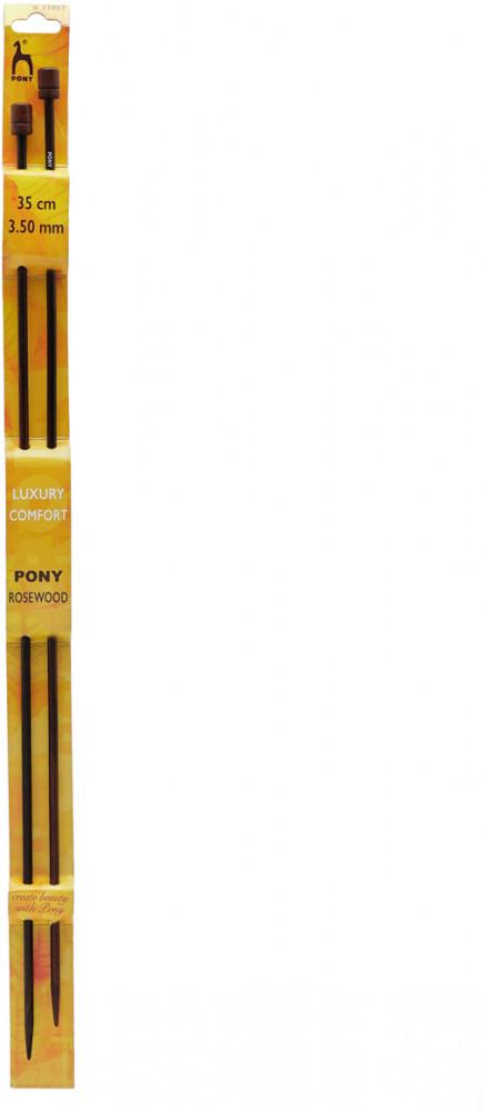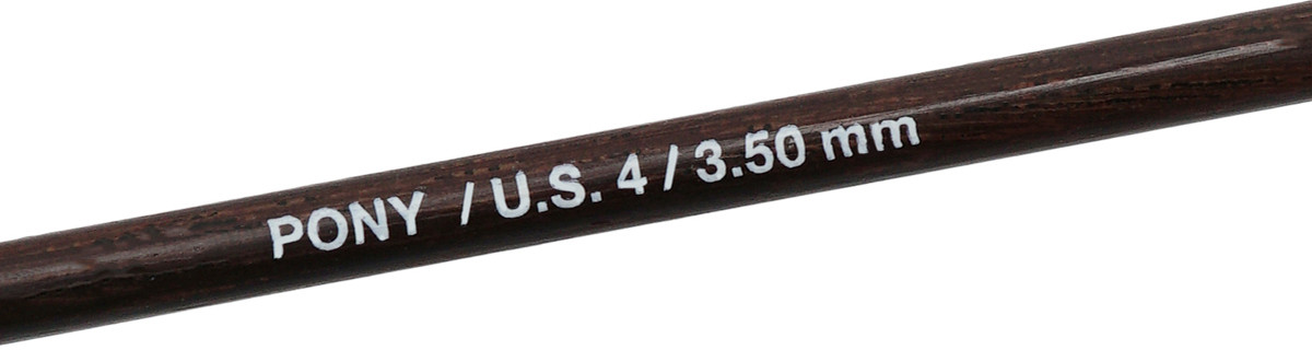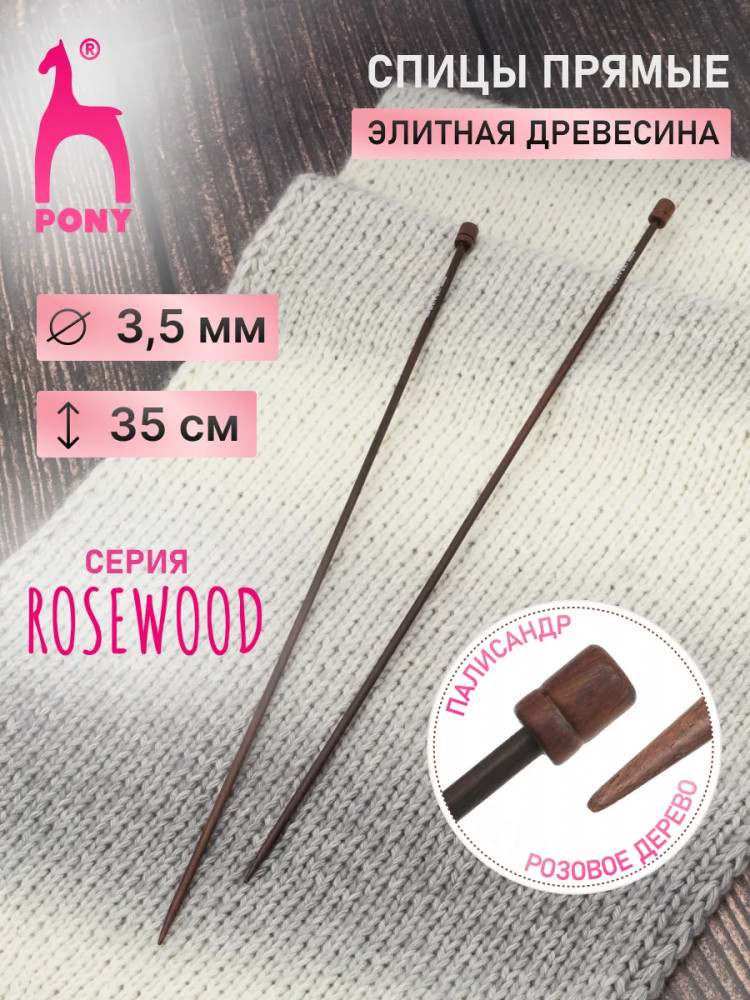 Прямые спицы Pony стандартной длины 35 см с ограничителями, которые препятствуют соскальзыванию петель. Предназначены для вязания шарфов и крупных деталей одежды, таких как спинка и передняя часть свитера. Изготовлены из ценного материала — бразильского розового дерева. Подходят для скользкой пряжи: мерсеризованного хлопка, вискозы, шелка.
