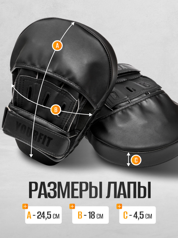 • размеры и форма: лапы имеют размеры 24.5 см (высота), 18 см (ширина) с глубиной 4.5 см. Эти размеры идеально подходят для тренировки различных типов ударов, отрабатывая как одиночные удары, так и комбинации. асимметричная форма лап позволяет точно имитировать удары реального противника;