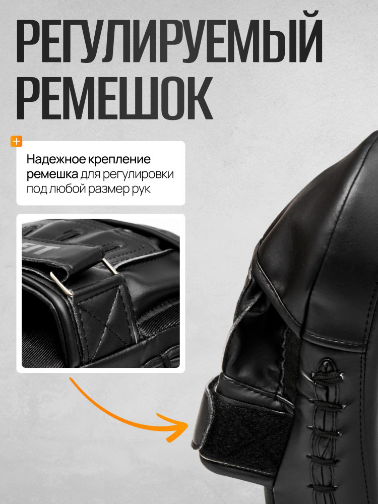 • регулируемый ремешок: Лапы оснащены надежным ремешком, который легко регулируется, обеспечивая идеальную посадку на руке тренера. Это позволяет использовать лапы как для правой, так и для левой руки, и гарантирует удобство при длительных тренировках;