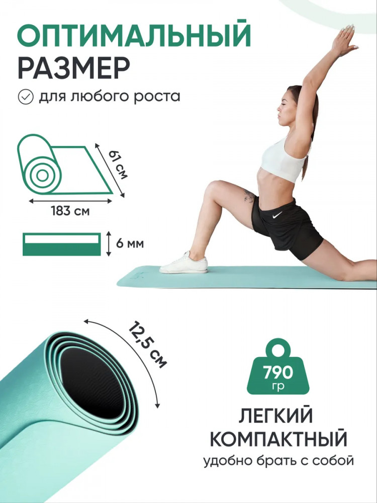 Спортивный коврик создан специально для занятий спортом, он надежно фиксируется на любой поверхности благодаря своей текстурированной поверхности. Благодаря своей легкости, коврик легко взять с собой в спортзал, студию йоги или в дорогу. Ремень для коврика йоги позволяет легко переносить его с места на место. Его компактные размеры делают его идеальным вариантом также для туристических поездок и кемпинга. Толщина в 6 мм обеспечивает необходимую амортизацию и комфорт во время занятий йогой и фитнесом, защищая суставы и колени.
