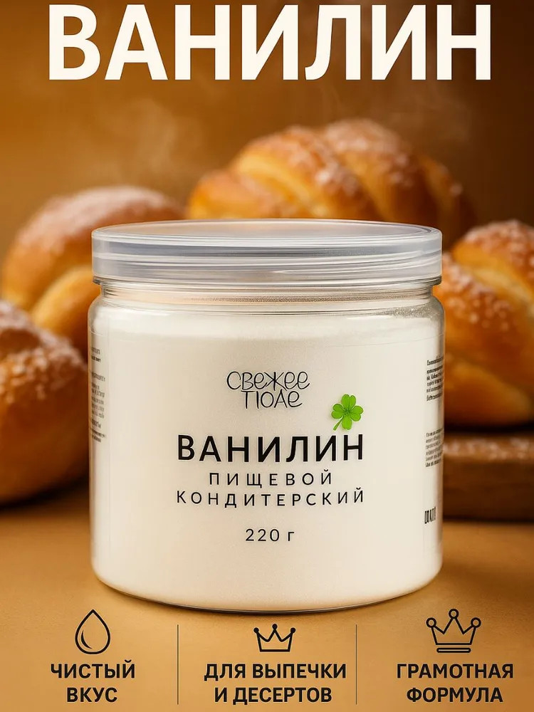 Ванилин для выпечки кондитерский пищевой 220 — ароматная приправа, идеально подходящая для создания нежного, сладкого аромата в десертах и выпечке. Продукт упакован в практичную герметичную банку, что сохраняет свежесть и насыщенность аромата надолго. Подходит как для домашнего использования, так и для профессиональных кухонь — будь то ресторан, кафе, пекарня, столовая или кондитерская. Ароматная пряность придаёт изысканный вкус и запах множеству блюд: маффинам, кексам, булочкам, блинам, печенью, вафлям, творожным запеканкам, сырникам, панна-котте, кремам, мороженому и напиткам вроде какао или молочных коктейлей. Ванилин также применяется для выпечки хлеба, сдобных изделий и праздничных тортов. Отлично сочетается с такими специями, как корица, гвоздика, кардамон, мускатный орех и имбирь, создавая ароматное ассорти вкусов.