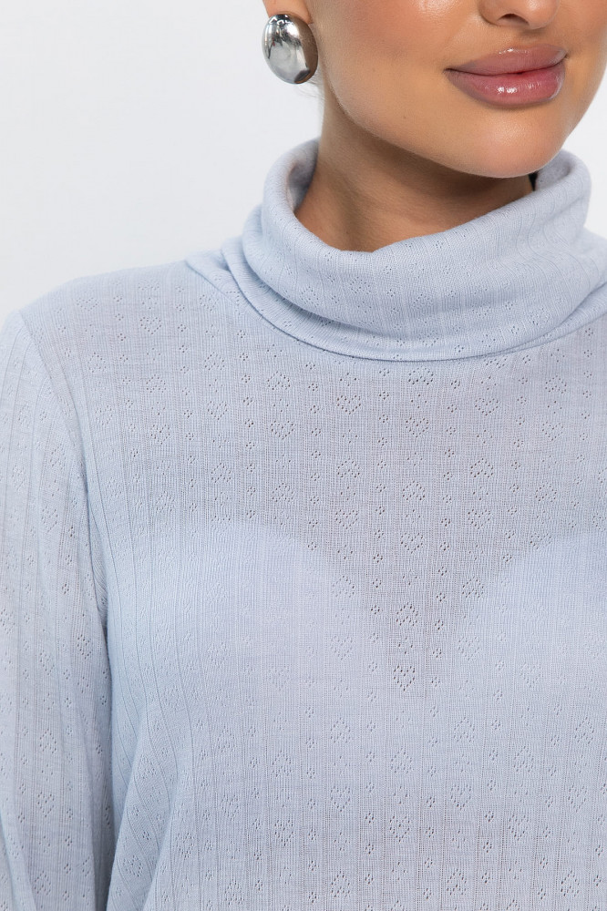 Ажурный трикотажный джемпер в нежно-голубом цвете — идеальный выбор для создания стильных повседневных образов. Модель с втачным удлиненным рукавом и воротником-хомутом придает современный силуэт. Асимметричный крой низа, с удлинением от центра к бокам, добавляет оригинальности. Ткань с перфорацией в виде сердечек придает образу нежность и романтичность. Создайте модные и комфортные образы с нашим новым джемпером!