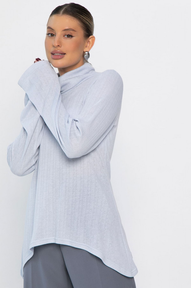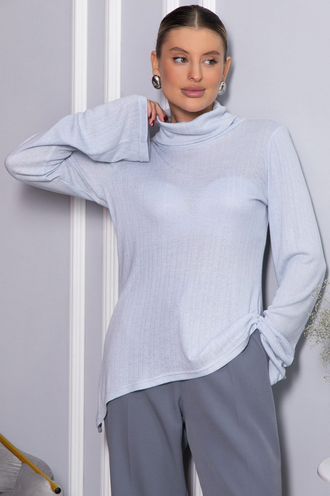 Ажурный трикотажный джемпер в нежно-голубом цвете — идеальный выбор для создания стильных повседневных образов. Модель с втачным удлиненным рукавом и воротником-хомутом придает современный силуэт. Асимметричный крой низа, с удлинением от центра к бокам, добавляет оригинальности. Ткань с перфорацией в виде сердечек придает образу нежность и романтичность. Создайте модные и комфортные образы с нашим новым джемпером!