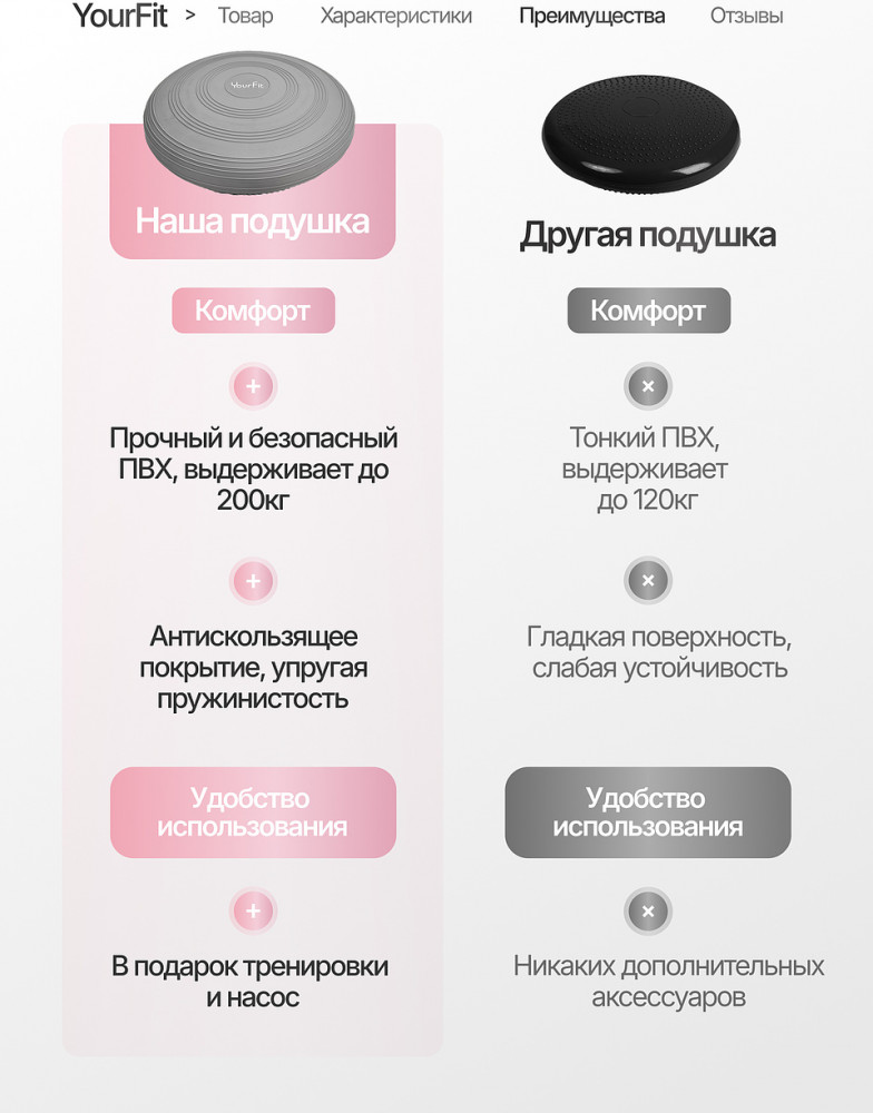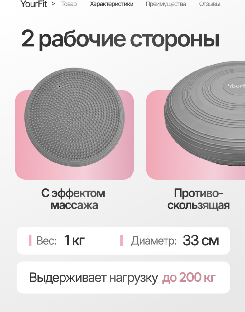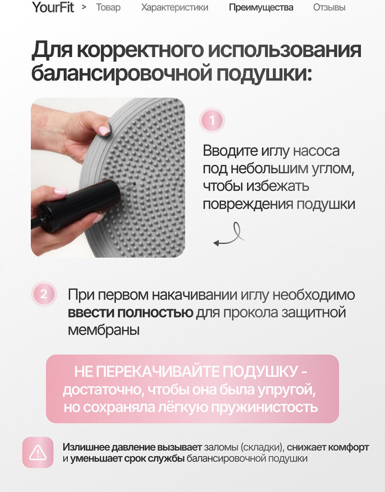 Балансировочная подушка выполнена из прочного и эластичного ПВХ высокого качества с антипроскальзывающей поверхностью, обеспечивающей надёжное сцепление с полом и устойчивость при упражнениях. Материал безопасен, не имеет запаха и легко очищается. Диаметр подушки составляет около 33 см, высота платформы — 5–6 см, что делает её удобной для выполнения упражнений различной сложности. Благодаря системе регулировки жёсткости (через накачивание воздуха), можно подобрать оптимальный уровень давления — мягче для начинающих или плотнее для продвинутых пользователей. Подушка выдерживает нагрузку до 120 кг, что позволяет использовать её людям разного веса и уровня подготовки.