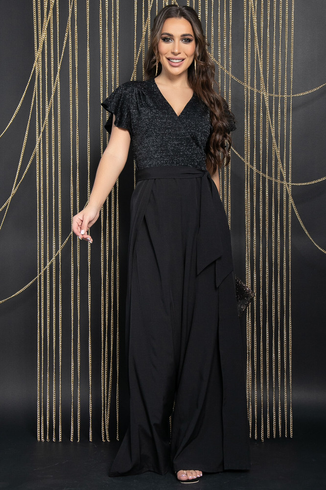 Шикарный комбинезон полуприлегающего силуэта с укороченным рукавом подходит для любой фигуры. Умеренно-глубокий V-образный вырез сбалансирован макси-длиной и полностью закрытой спинкой. Застежка на потайной молнии по спинке. Легкая драпировка в области груди добавляет немного объёма в нужном месте, а пояс на шлевках в комплекте эффектно подчеркивает линию талии, что обеспечит вашему образу утонченный стиль. Запахивающиеся штаны придают всему образу легкость и чувственность, добавляя неотразимости.