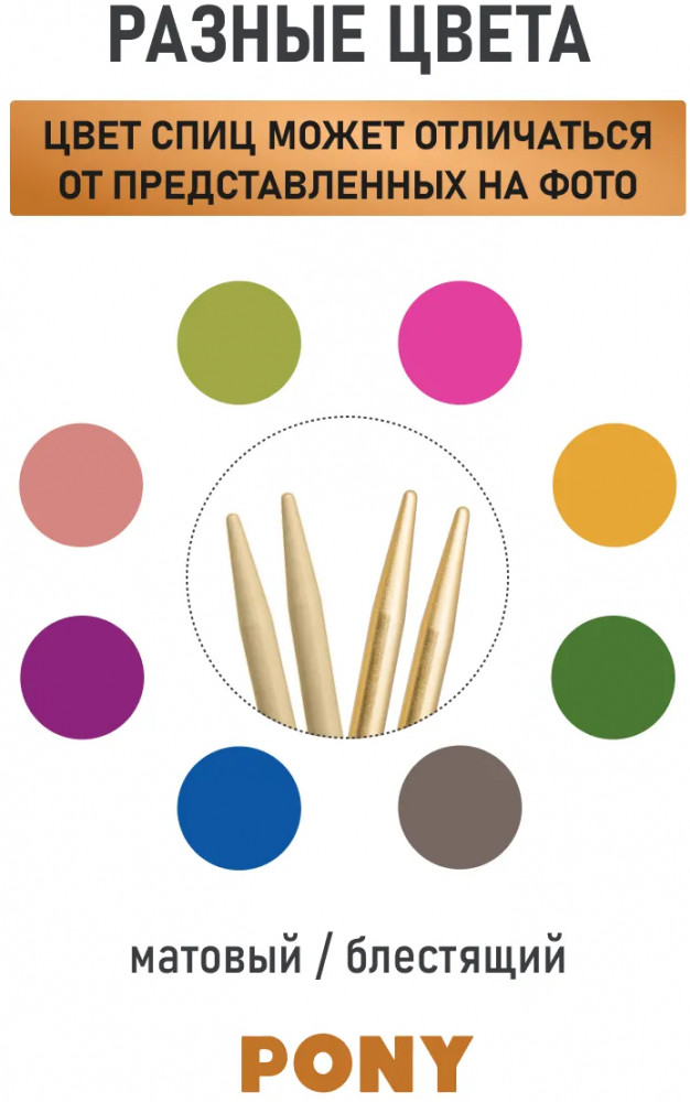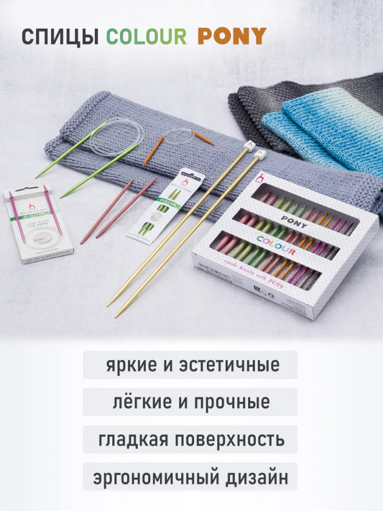 Спицы практически не гнутся, сохраняя свою форму даже при интенсивном использовании. Безупречно гладкая поверхность спиц предотвращает зацепки и образование узелков. Ваша нить будет двигаться свободно и плавно, создавая ровное полотно. Слегка закругленные концы спиц мягко скользят между петлями, не цепляясь за волокна. Кроме того, закругленные концы не травмируют пальцы. Спицы Pony снабжены нестираемой маркировкой с указанием размера, позволяя легко выбирать нужный инструмент для конкретного проекта. Вязание с помощью спиц Pony Colour превратится в настоящее удовольствие, даря радость творчества и вдохновляя на создание уникальных и неповторимых вещей.