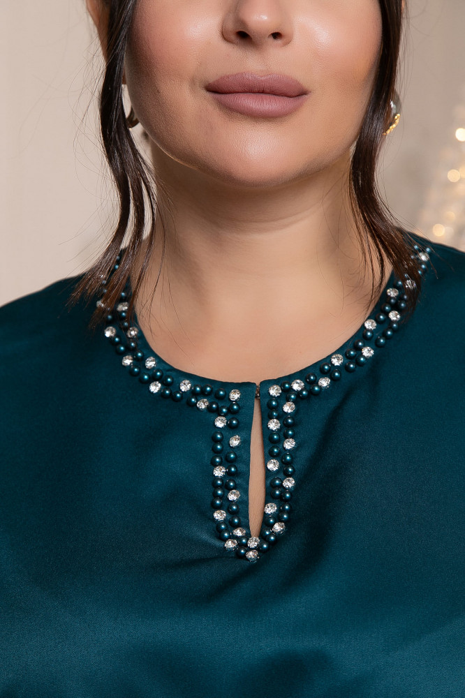 - Горловина: Украшена сверкающими стразами и изящными бусинами, что мгновенно притягивает взгляд и отражает свет, делая наряд ещё более привлекательным.