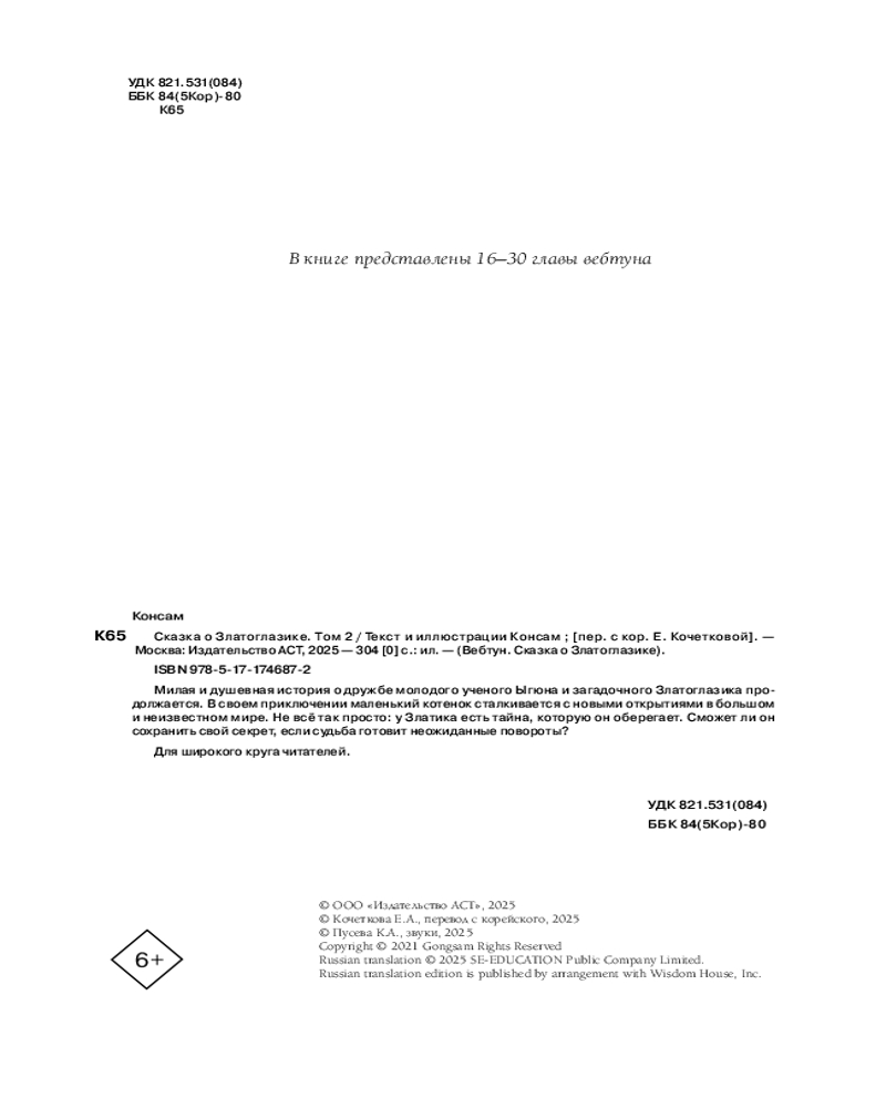 Серия: Вебтун. Сказка о Златоглазике Милая и душевная история о дружбе молодого ученого Ыгюна и загадочного котенка Златоглазика продолжается. В своем приключении маленький котенок сталкивается с новыми открытиями в большом и неизвестном мире. Не всё так просто: у Златика есть тайна, которую он оберегает. Сможет ли он сохранить свой секрет, если судьба готовит неожиданные повороты? |