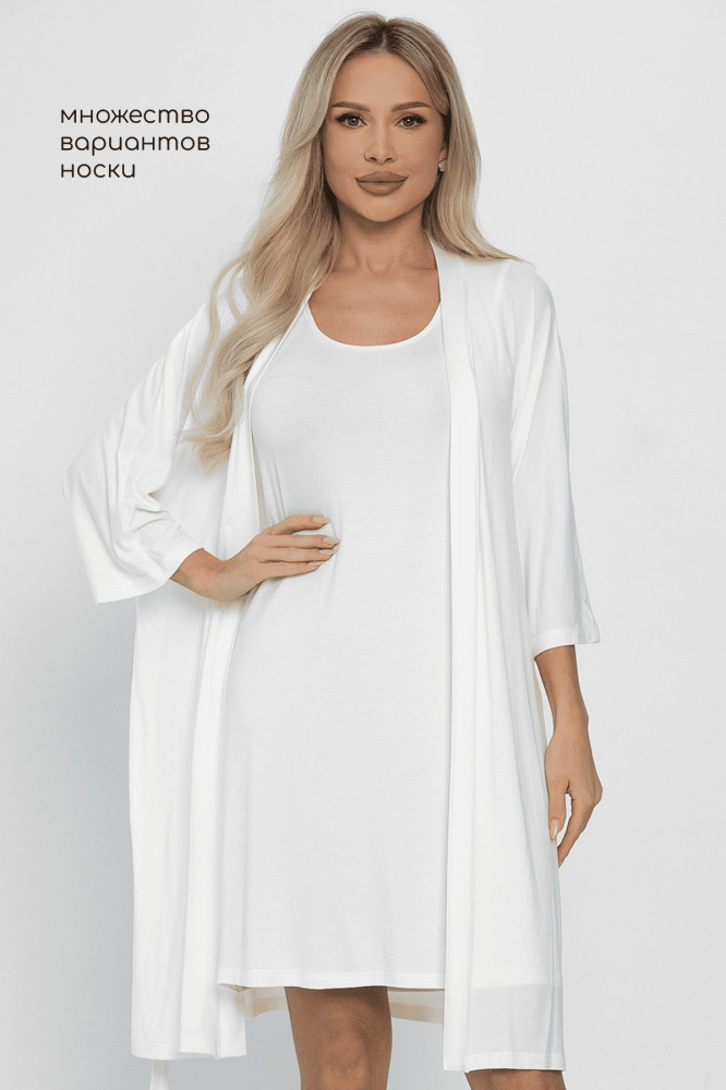 Идеальный выбор для создания уюта и расслабления в домашней обстановке. Этот пеньюар станет вашим верным спутником для спокойных вечеров, утреннего кофе или просмотра фильмов. Свободный крой и рукава длиной три четверти обеспечивают максимальный комфорт и свободу движений, а пояс из основной ткани идет в комплекте. Он создан специально для того, чтобы дарить радость и создавать атмосферу роскоши и уюта каждый день. Пеньюар изготовлен из мягкой вискозы с добавлением лайкры, что делает его приятным на ощупь и идеально подходящим для расслабленного и стильного домашнего образа.