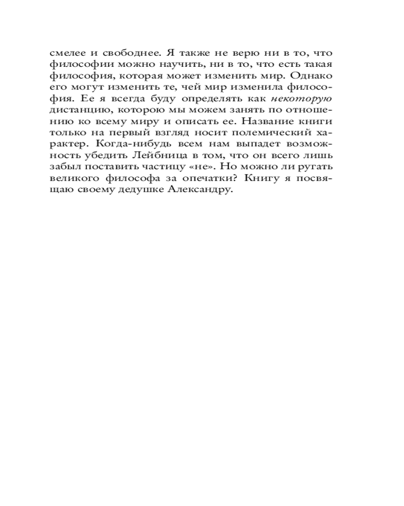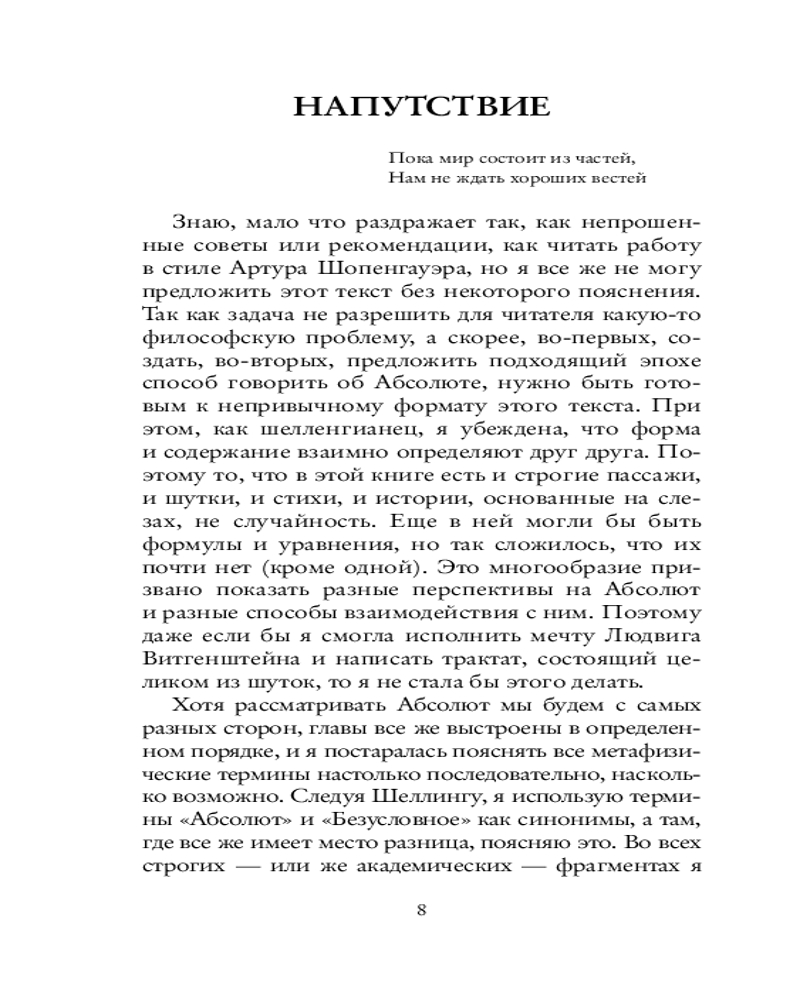 Серия: Российская академия «Лучший из невозможных миров» — это книга о поиске Абсолюта, написанная на стыке строгой философской мысли и личного опыта. Как и принято в немецком идеализме, главный герой книги — сам читатель. Продвигаясь по «тропинкам к Абсолюту», он пройдет путь от самых простых житейских интуиций о мире до сложных метафизических идей, например о том, что мира могло бы и не быть. Всю дорогу героя сопровождают философ Фридрих Шеллинг, всемирно известный художник Каспар Давид Фридрих и, конечно, сам автор, который на самых сложных поворотах рассказывает о том, как философия уже изменила и даже спасла ее жизнь. |