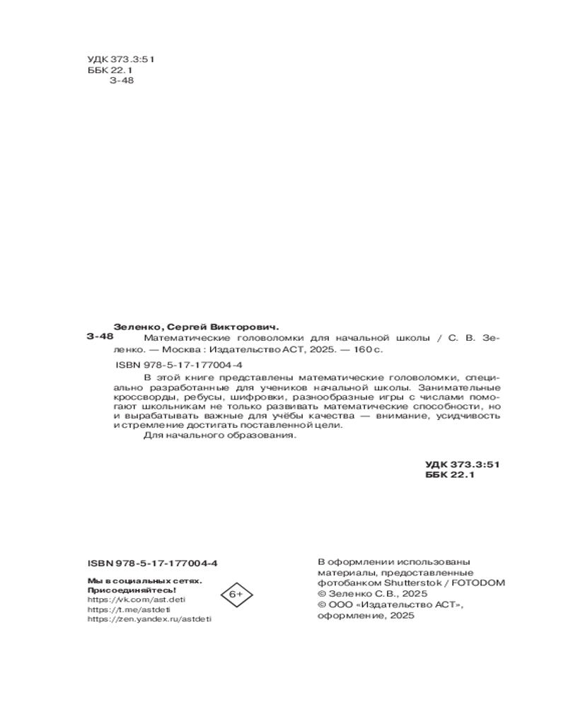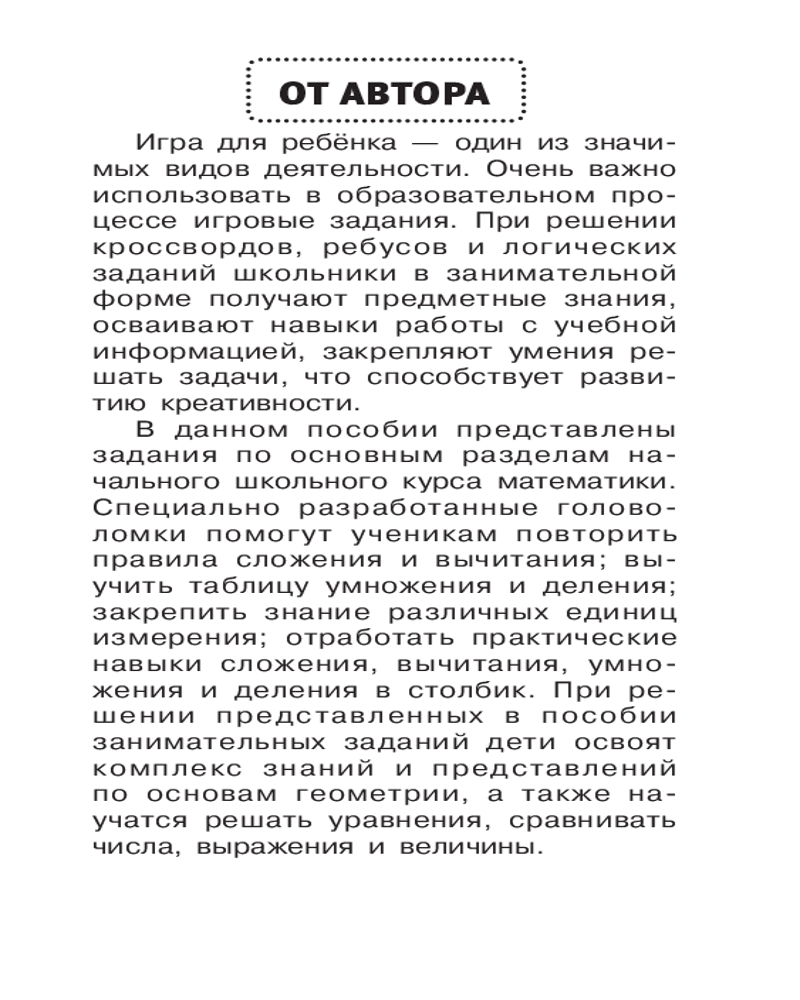 Серия: Разминка для ума В этой книге представлены математические головоломки, специально разработанные для учеников начальной школы. Занимательные кроссворды, ребусы, шифровки, разнообразные игры с числами помогают школьникам не только развивать математические способности, но и вырабатывать важные для учёбы качества — внимание, усидчивость и стремление достигать поставленной цели. |