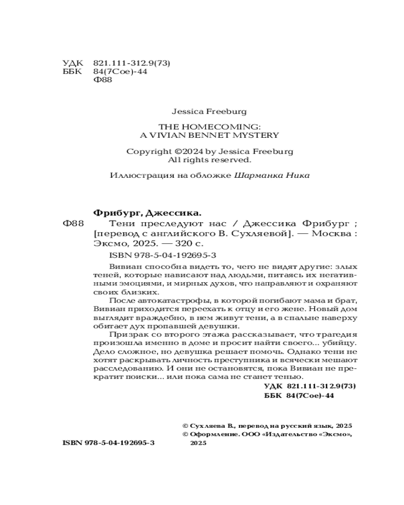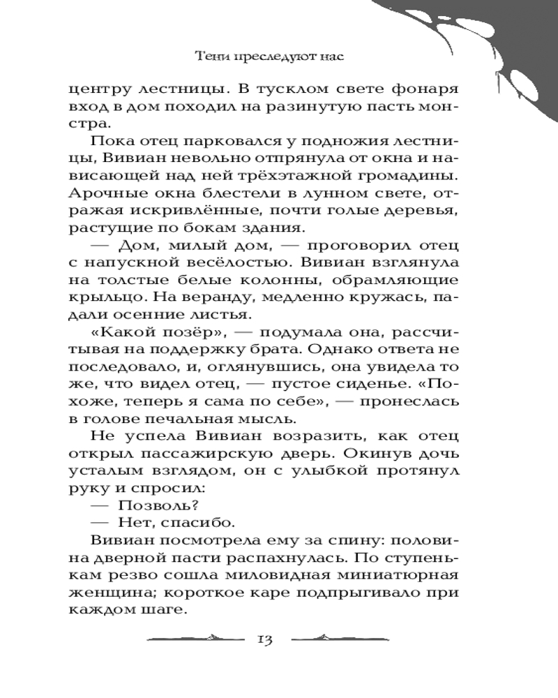 Серия: Страшные истории, рассказанные у костра Вивиан способна видеть то, чего не видят другие: злых теней, которые нависают над людьми, питаясь их негативными эмоциями, и мирных духов, что направляют и охраняют своих близких. После автокатастрофы, в которой погибают мама и брат, Вивиан приходится переехать к отцу и его жене. Новый дом выглядит враждебно, в нем живут тени, а в спальне наверху обитает дух пропавшей девушки. Призрак со второго этажа рассказывает, что трагедия произошла именно в доме, и просит найти своего... убийцу. Дело сложное, но девушка решает помочь. Однако тени не хотят раскрывать личность преступника и всячески мешают расследованию. И они не остановятся, пока Вивиан не прекратит поиски... или пока сама не станет тенью. |