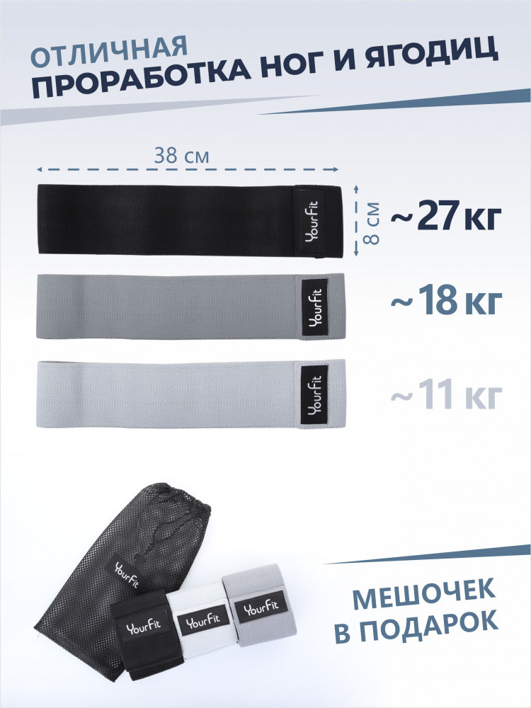 YourFit Набор тканевых фитнес-резинокновинка В данный момент этот товар отсутствует в продаже. Возможно, у нас найдется аналогичный или похожий товар здесь. Тканевые ленты мягко прилегают, не скользят по одежде и не скручиваются. Обе версии долговечны и подходят для тренировок дома и в зале, для женщин и мужчин. Уровни сопротивления и эластичность Доступны три уровня: легкое / среднее / высокое. Легкое — техника и разогрев, восстановление, первые шаги для женщин и начинающих. Среднее — базовые силовые комплексы для ног и ягодиц и для рук, круговые тренировки. Высокое — прогресс силы, акцентные упражнения, работа на мощность как с силовой резинкой. Эластичность предсказуемая: чем больше растяжение, тем выше нагрузка. |