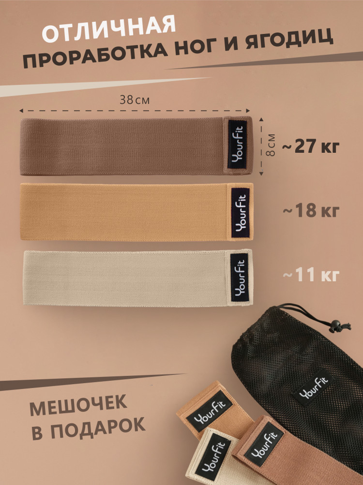 YourFit Набор тканевых фитнес-резинокновинка В данный момент этот товар отсутствует в продаже. Возможно, у нас найдется аналогичный или похожий товар здесь. Тканевые ленты мягко прилегают, не скользят по одежде и не скручиваются. Обе версии долговечны и подходят для тренировок дома и в зале, для женщин и мужчин. Уровни сопротивления и эластичность Доступны три уровня: легкое / среднее / высокое. Легкое — техника и разогрев, восстановление, первые шаги для женщин и начинающих. Среднее — базовые силовые комплексы для ног и ягодиц и для рук, круговые тренировки. Высокое — прогресс силы, акцентные упражнения, работа на мощность как с силовой резинкой. Эластичность предсказуемая: чем больше растяжение, тем выше нагрузка. |
