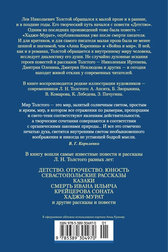 Серия: Русская литература. Большие книги Лев Николаевич Толстой обращался к малой прозе и в ранние, и в поздние годы. Его творческий путь начался с повести «Детство». Одним из последних произведений тоже была повесть — «Хаджи-Мурат», опубликованная уже после смерти писателя. И для критиков, и для самого писателя малая проза была не менее ценной и значимой, чем «Анна Каренина» и «Война и мир». В ней, как и в романах, Толстой обращается к внутреннему миру человека, исследует диалектику его души. Не случайно духовные искания героев повестей и рассказов Толстого — Николеньки Иртенева, Дмитрия Оленина, Дмитрия Нехлюдова и других — и сегодня находят живой отклик у современных читателей. |