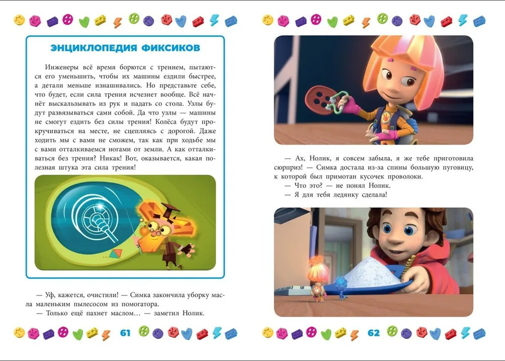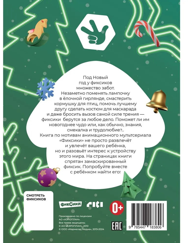 Серия: Добрые истории Под Новый год у фиксиков множество забот. Незаметно поменять лампочку в ёлочной гирлянде, смастерить кормушку для птиц, помочь лучшему другу сделать костюм для маскарада и даже бросить вызов самой силе трения — фиксики берутся за любое дело. Поможет ли им новогоднее чудо или, как обычно, знания, смекалка и трудолюбие?.. Книга по мотивам анимационного мультсериала «Фиксики» не просто развлечёт и увлечёт вашего ребёнка, но и разовьёт интерес к устройству этого мира. На страницах книги спрятан замаскированный фиксик. Попробуйте вместе с ребёнком найти его! |