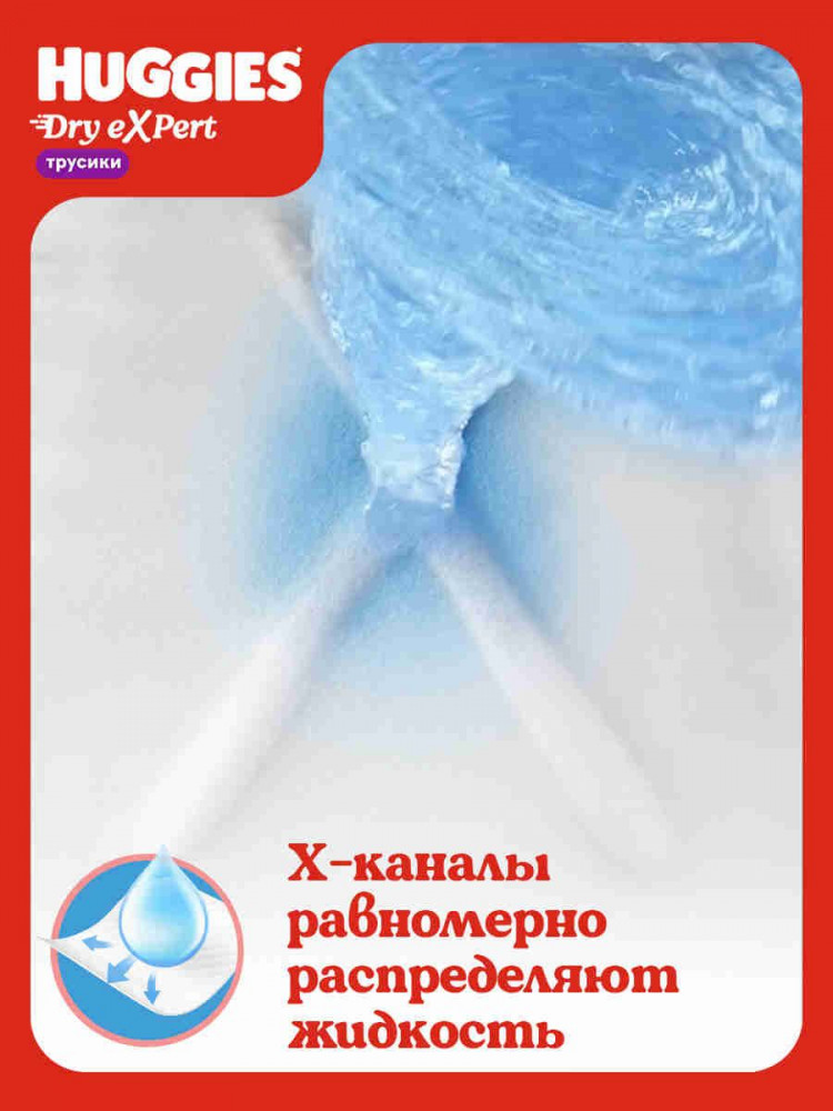 Инновационные трусики-подгузники Huggies Dry eXpert с Х-каналами — настоящие эксперты в сухости и комфорте. Уникальные Х-каналы, словно воронка, впитывают жидкость Х2 быстрее и равномерно распределяют ее. Технология FlexFit: трусики остаются удобными и пластичными даже в наполненном виде, и никакого комка между ножек. Технологичный суперабсорбент надежно удерживает влагу внутри надолго. Кожа малыша остается сухой до 12 часов. Эластичные барьерчики обеспечивают двойную защиту от протеканий. Мягкие материалы обеспечат маленьким экспертам дополнительный комфорт. Инновационные подгузники трусики Хаггис с Х-каналами не содержат отдушек, хлора и латекса. Яркий и веселый дизайн детских подгузников подойдет и мальчикам, и девочкам.