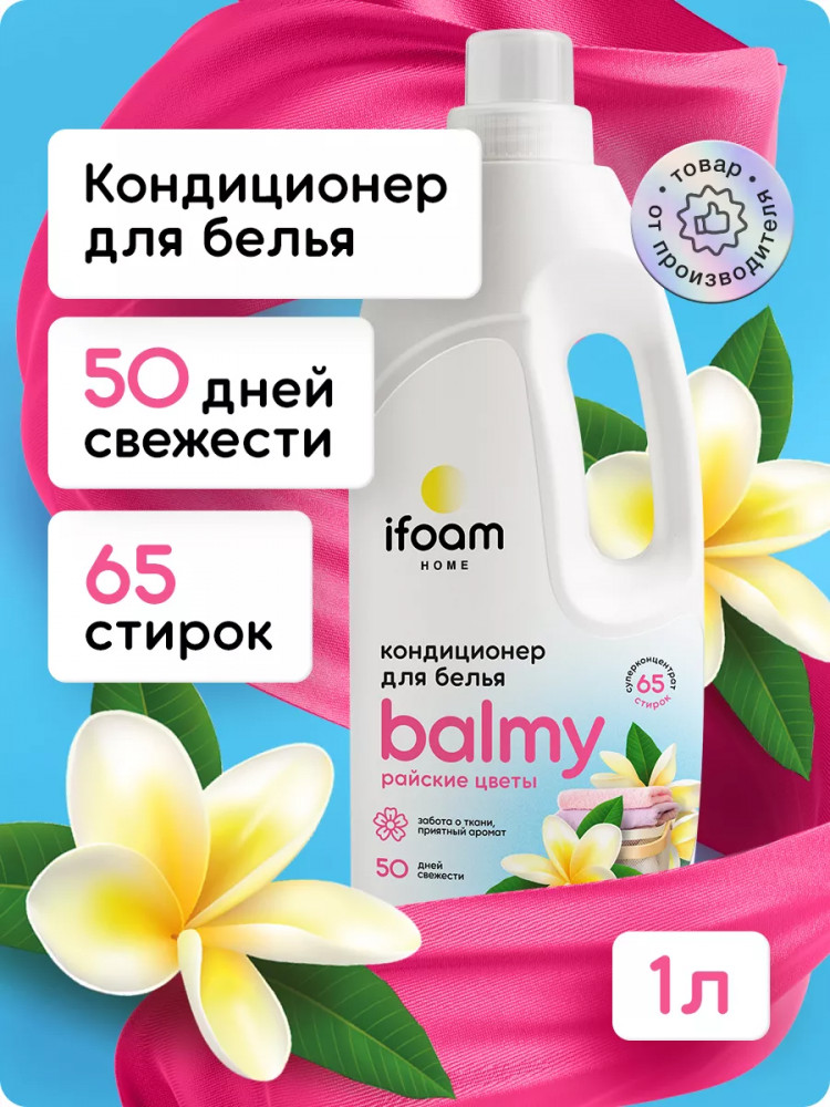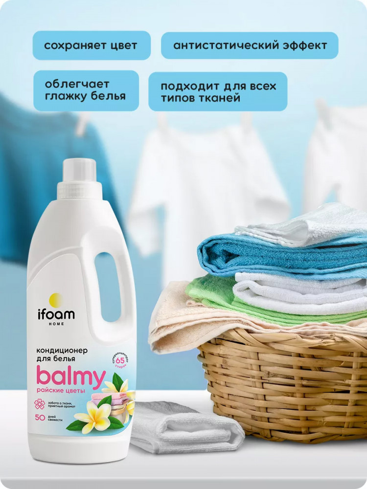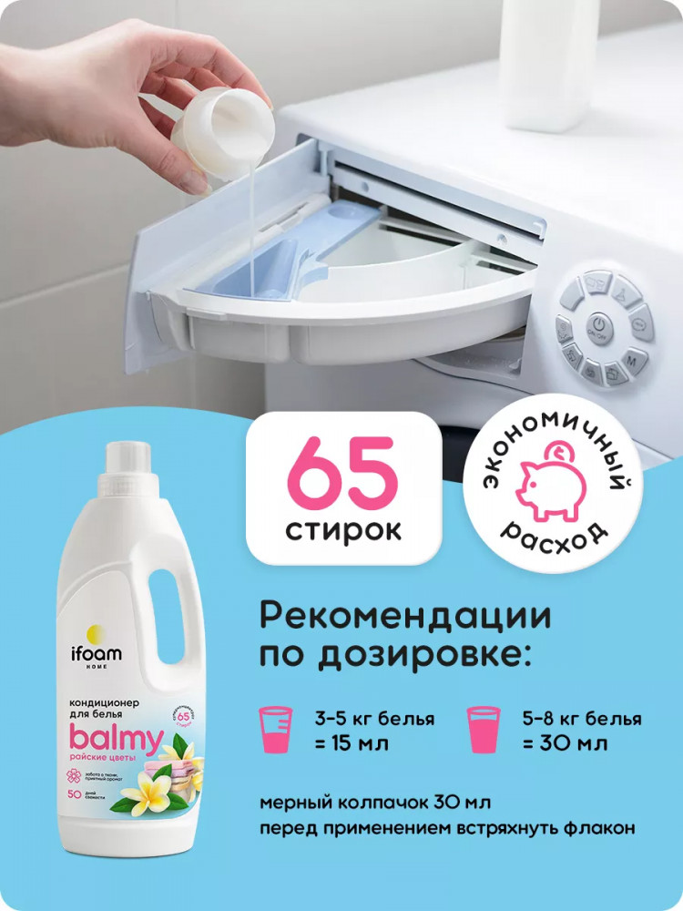 Кондиционер-ополаскиватель для белья Balmy райские цветы смягчает белье после стирки, придает свежесть и деликатный тонкий аромат. Бальзам-ополаскиватель бережно ухаживает за всеми типами (видами) тканей, в том числе деликатными. Обладает эффектом антистатика, облегчает глажку и продляет срок службы изделий. Кондиционер для белья защищает вещи от потери формы, выцветания и образования катышков. Эффективен в мягкой и в жесткой воде.