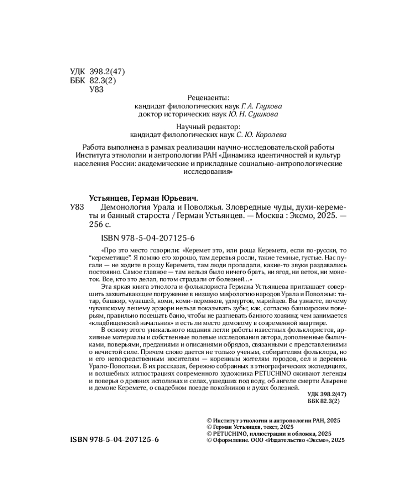 Половинчатый человек, лесной дядя, банница с коровьими ногами, злой ветер, покойницкие и чертовы свадьбы, великаны-онары в лаптях с Ноев ковчег и демоны в глиняных горшках... Весь окружающий нас мир, согласно поверьям народов Урала и Поволжья — татар, башкир, чувашей, коми, коми-пермяков, удмуртов, марийцев, — населен духами и древними силами, соседствующими с человеком: от духов — покровителей лесов, рек, озер и хозяйства до враждебных шайтанов и кереметов, зловещих двойников, оживающих покойников и демонов болезней.