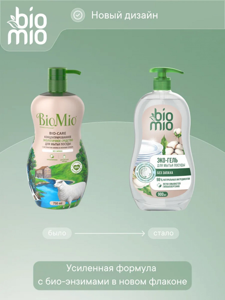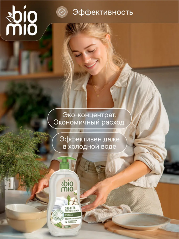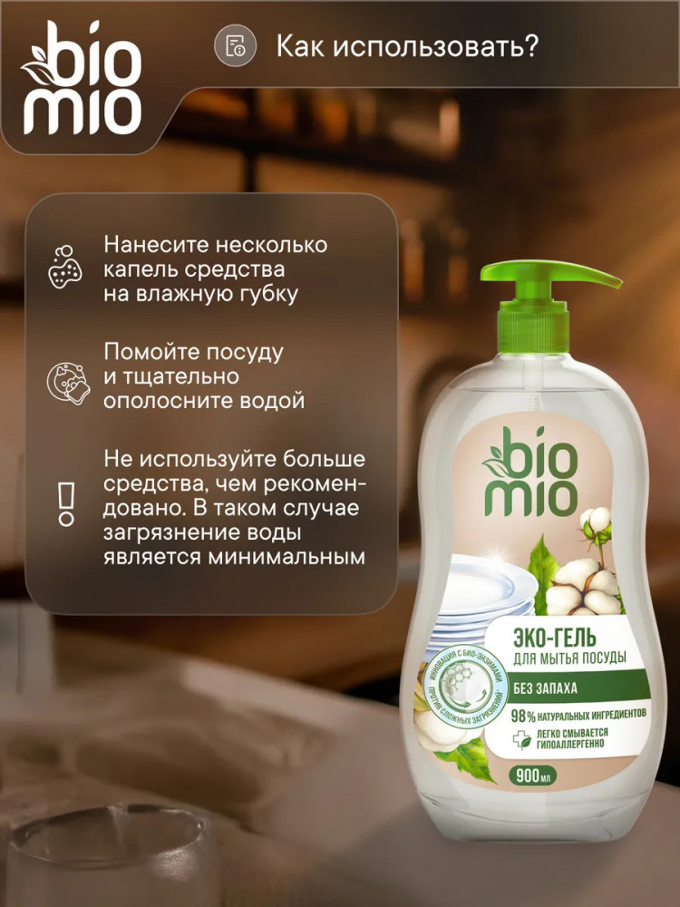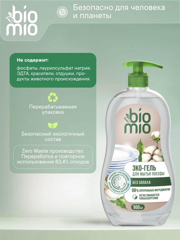 Эко-гель для мытья посуды BioMio без запаха — это эффективное и бережное средство для чистоты вашей посуды. Благодаря инновационной запатентованной технологии Био-энзим/Bio-enzyme на основе липазы и циклодекстринов, гель легко справляется с остатками пищи, в том числе с пригоревшим жиром и стойкими запахами, даже в холодной воде. Большой формат упаковки и концентрированная формула позволяют экономно расходовать средство, а натуральный состав с экстрактом хлопка и ионами серебра обеспечивает деликатное очищение. Эко гель концентрат с дозатором предназначен для мытья посуды и аксессуаров кухни. Экологичное моющее средство подходит для использования при уходе за детской посудой и бутылочками (гипоаллергенная формула протестирована дерматологами). Средство легко смывается водой, не оставляя следов и разводов. Формула на 98% состоит из ингредиентов натурального происхождения, биоразлагаема и безопасна для септиков.