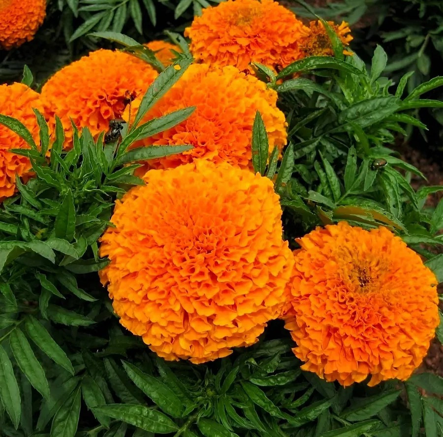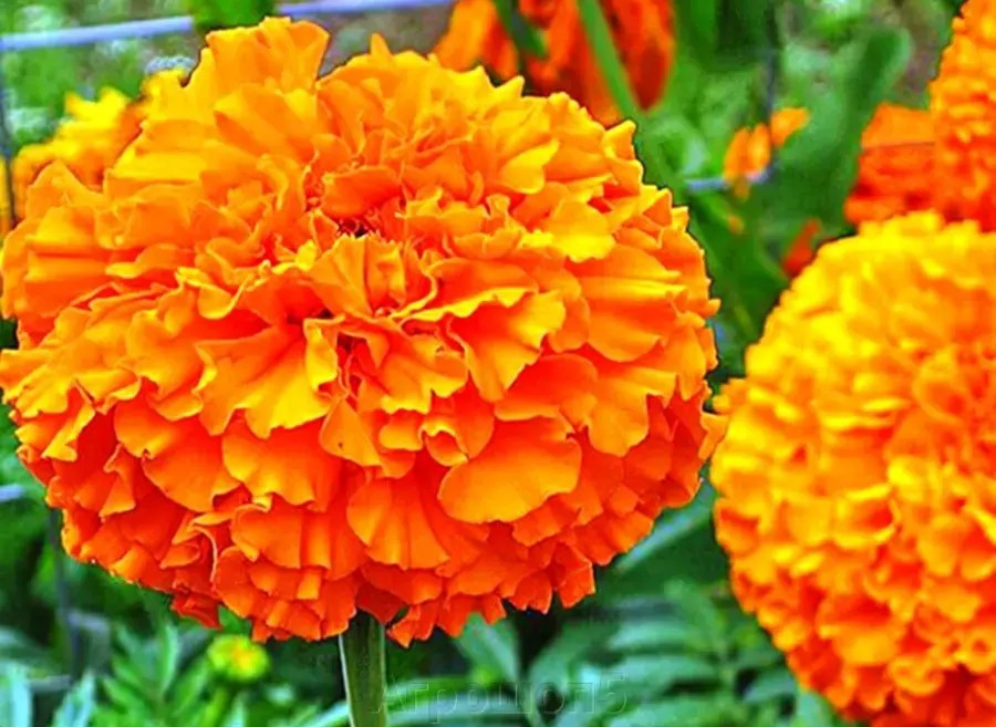 Густомахровые бархатцы с пышными «апельсиновыми» соцветиями. Ветвистые устойчивые кусты высотой* до 0,8-1 м зацветают в июне. Они отличаются высокой декоративностью, однородностью, не боятся ветра и дождя. Крепкие цветоносы надежно удерживают россыпь крупных соцветий диаметром около 8 см. Бархатцы ценятся за не прерывное цветение. Зелень и цветки этих растений надолго сохраняют яркость и свежесть. Сорт прекрасно выглядит на заднем плане цветников при высадке группами. Великолепен в срезке. |
