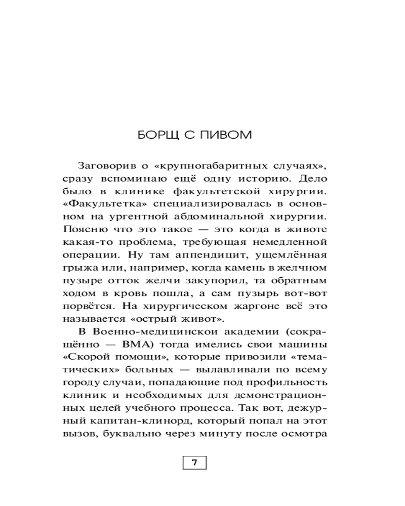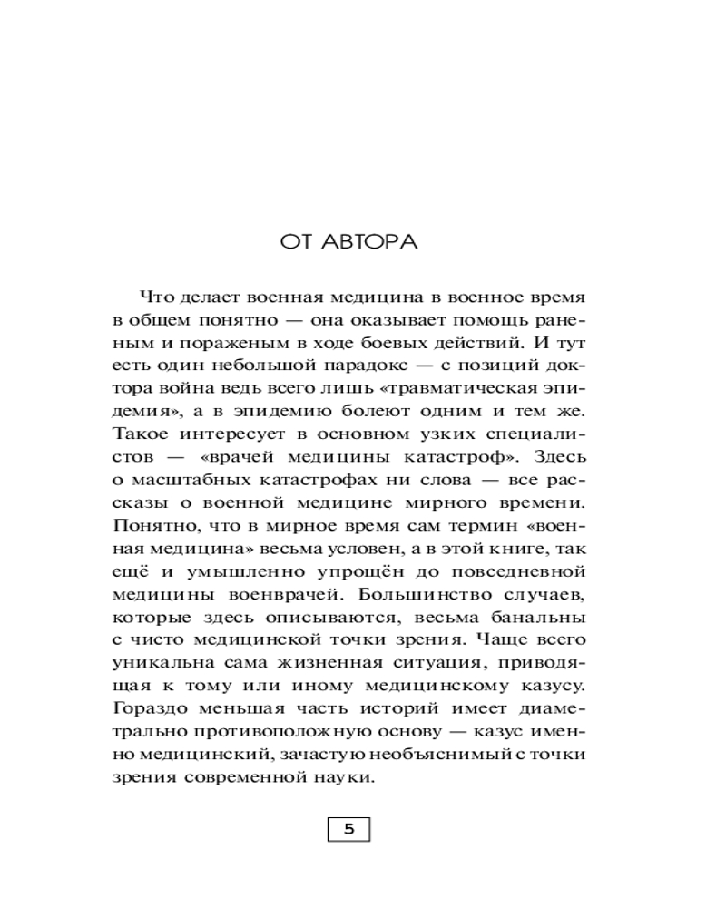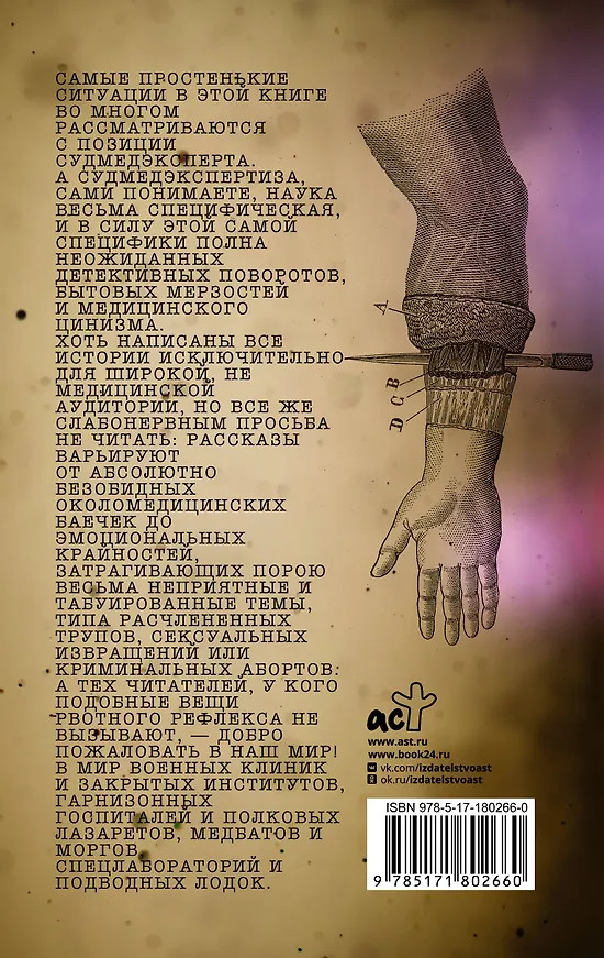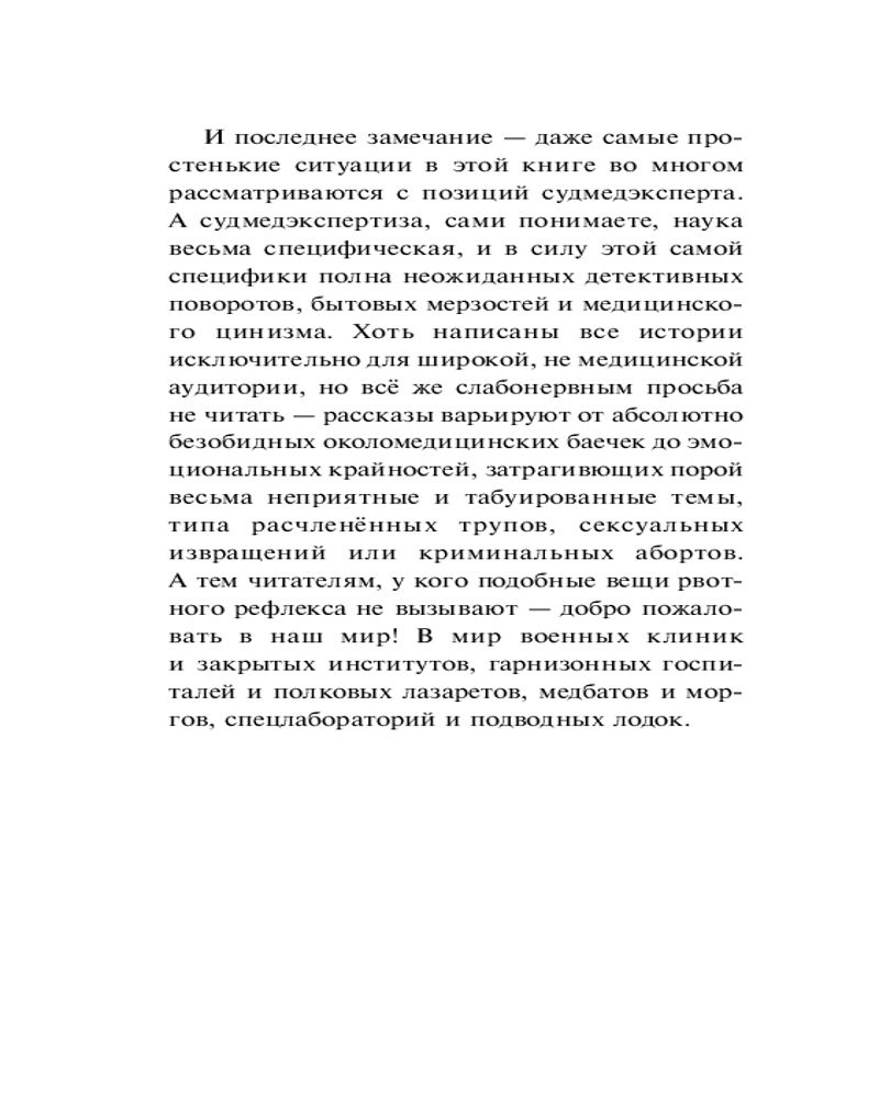 Серия: Медицинские хроники Самые простенькие ситуации в этой книге во многом рассматриваются с позиций судмедэксперта. А судмедэкспертиза, или судмедэкспертиза, сами понимаете, наука весьма специфическая, и в силу этой самой специфики полна неожиданных детективных поворотов, бытовых мерзостей и медицинского цинизма. Хоть написаны все истории исключительно для широкой, не медицинской аудитории, но всё же слабонервным просьба не читать — рассказы варьируют от абсолютно безобидных околомедицинских баек до эмоциональных крайностей, затрагивающих порою весьма неприятные и табуированные темы, типа расчлененных трупов, сексуальных извращений или криминальных абортов. А тем читателям, у кого подобные вещи рвотного рефлекса не вызывают — добро пожаловать в наш мир! В мир военных клиник и закрытых институтов, гарнизонных госпиталей и полковых лазаретов, медбатов и моргов, спецлабораторий и подводных лодок. |
