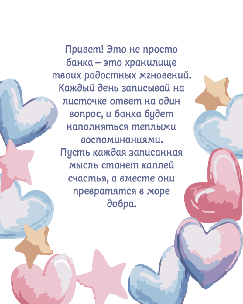 Серия: Мечтай! Волшебные блокноты для тех, кто верит в чудеса Говорят, если в конце дня ты можешь вспомнить хотя бы одно приятное мгновение — ты уже счастливый человек. Но счастье — вещь хрупкая. Если его не сохранять, оно легко теряется, как сны наутро. Именно для этого и создана «Банка счастья» — чтобы стать бережным хранилищем твоих светлых моментов, которые делают жизнь по-настоящему теплой. Эта авторская методика уникальна и помогла обрести счастье тысячам людей. Каждый день здесь можно записывать моменты, которые подарили улыбку: теплое утро с чашкой любимого кофе, встречу с близкими, приятную мелочь, которая вдруг сделала день особенным. Неважно, большая это радость или крошечная деталь, — всё это станет твоими сокровищами, которые однажды превратятся в целую банку счастливых воспоминаний. |
