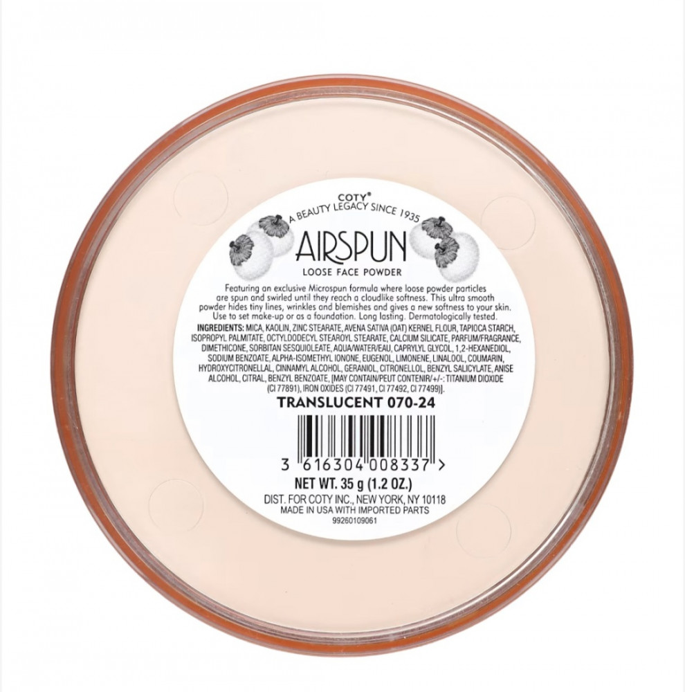 Mica, Kaolin, Zinc Stearate, Avena Sativa (Oat) Kernel Flour, Tapioca Starch, Isopropyl Palmitate, Octyldodecyl Stearoyl Stearate, Calcium Silicate, Parfum/Fragrance, Dimethicone, Sorbitan Sesquioleate, Aqua/Water/Eau, Caprylyl Glycol, 1,2-Hexanediol, Sodium Benzoate, Alpha-Isomethyl Ionone, Eugenol, Limonene, Linalool, Coumarin, Hydroxycitronellal, Cinnamyl Alcohol, Geraniol, Citronellol, Benzyl Salicylate, Anise Alcohol, Citral, Benzyl Benzoate, May Contain (+/-): Titanium Dioxide (CI 77891), Iron Oxides (CI 77491, CI 77492, CI 77499).