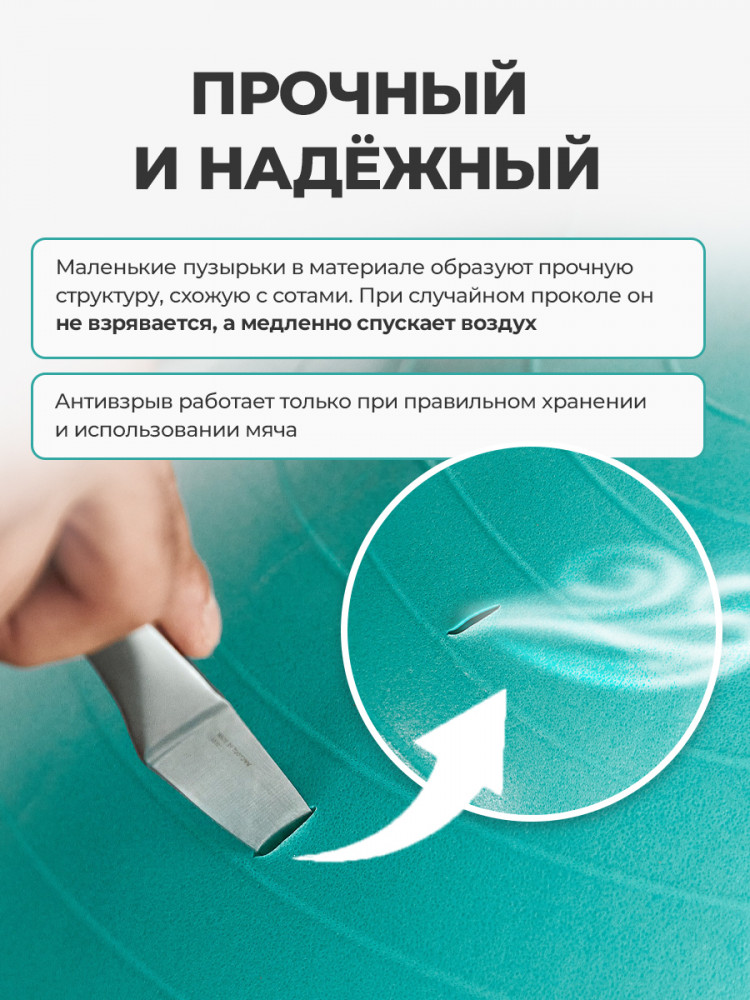Материал и безопасность эластичный ПВХ с системой антивзрыв (Anti-Burst). Даже при проколе мяч не лопается резко, медленно стравливает воздух — это повышает безопасность во время занятий. В описаниях мяча иногда называют «резиновый» — речь идет о прочном эластичном ПВХ. Плотность материала и максимальная нагрузка Плотный многослойный ПВХ сохраняет форму и обеспечивает стабильную опору в упражнениях. Максимально допустимая нагрузка для данной модели указана в характеристиках товара (ориентируйтесь на ваш вес и тип тренировки). Диаметр и регулировка жёсткости Диаметр подбирают по высоте: 65 см — рост примерно 165–180 см; 75 см — рост 180 см и выше. Жёсткость просто регулирует уровень накачивания: чуть мягче — для расслабления и растяжки, плотнее — для силовых и статических поз.